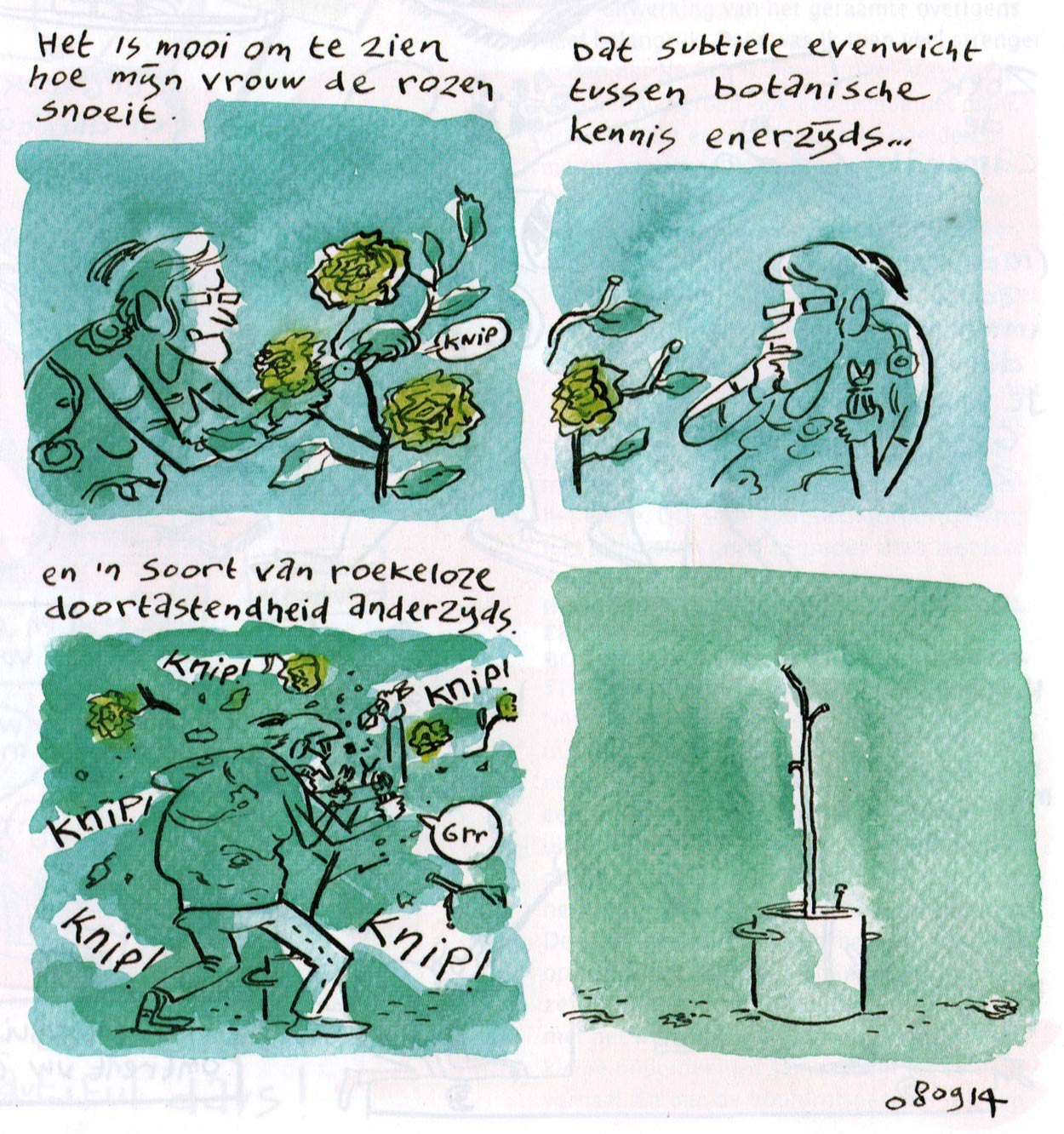 Cartoon by Michiel van de Pol. Translation: "Even Ton van Royen's last attempt to pamper his wife Heleen didn't help.'