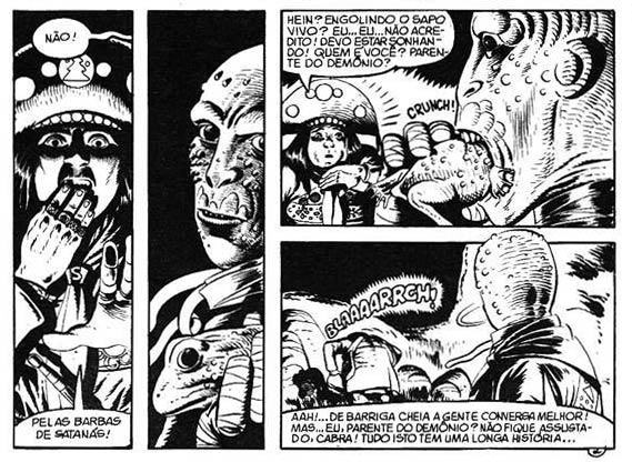 During the early 1970s, Portela's artwork first appeared in the local press, for instance the western comic 'O Águia' (1971), which he made in collaboration with his brother, the journalist Wilde Portela. He also provided covers and interior illustrations to Junior, the children's supplement of the local paper Diário de Pernambuco. By 1972, Portela was a regular contributor to this paper, which he supplied with cartoons and comic stories about historical subjects. Portela spent most of the 1970s working not only as a commercial artist, but also as a typist. Several of his early comic efforts have remained unpublished, for instance the three horror stories intended for Editorial Taika and the historical comics 'O Caçador de Esmeraldas' and 'Vida de Napoleão' for Adolfo Aizen's publishing label Ebal. In 1978, Watson Portela designed the cover art for the record 'Até a Amazônia?' by the Brazilian folk ensemble Quinteto Violado.