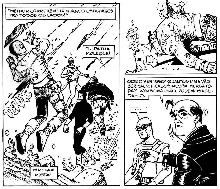 With Primaggio Mantovi, Portela provided the artwork for the 'War-Man' project (1988) of the Pão de Açucar group, which consisted of posters and comics for a freely distributed magazine. In 1989, he contributed science fiction stories to Pau-Brasil magazine of Editora Vidente. The same publisher also released a four-issue mini-series of Portela's cyberpunk series 'Paralelas'. Among his fanzine work during the 1980s were participations in Oscar C. Kern's Historieta, the Maturi magazine of the Comic Book Research Group from Rio Grande do Norte (GRUPEHQ) and Gang Portela, a 1986 fanzine edited by his sister Tête Portela.