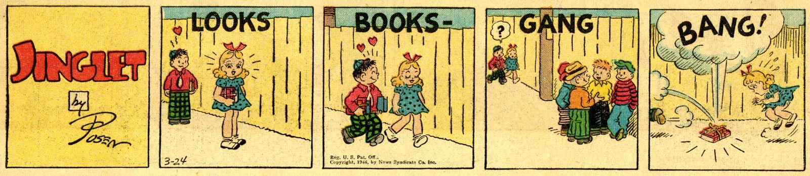 On 19 April 1926, Posen launched 'Jinglet' (1926-1950), which ran in The Chicago Tribune on a daily basis. The gags were simple and relied heavily on visual comedy, kicked off by a descriptive word at the top of each panel. Due to a lack of real dialogue, 'Jinglet' was basically a pantomime comic, except for a few key words. 'Jinglet' was discontinued on 19 March 1927, but enjoyed a revival as a companion strip to Posen's later New York News series 'Ella and Her Fella' and 'Sweeney & Son', until 1950. After a three-year hiatus, the feature returned in 1953 and remained the companion comic underneath 'Sweeney & Son' until both series were discontinued on 21 August 1960.