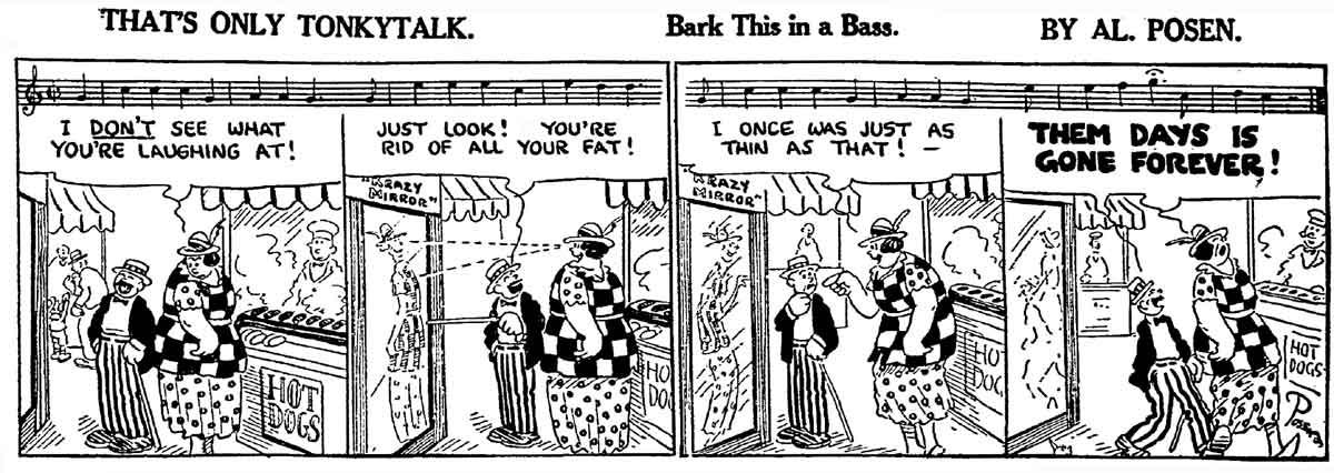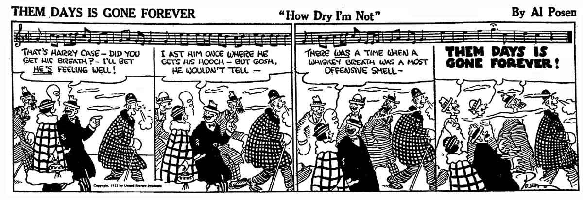 From 13 February 1922 to 4 April 1925, Posen drew the comic strip 'Them Days Is Gone Forever', followed by the weekly panel 'The Jingles Belles' (1924) and the daily cartoon 'Call for Mr. Bingo' (1925), all for United Feature Syndicate. Posen's move to cartooning was notable since he never had any professional artistic training. 'Them Days' also pioneered a format he would use throughout many of his comics, with dialogue on rhyme. 'Them Days Is Gone Forever' was told in four frames. The first three were typically in rhyme, while the fourth always had the same closing statement: "Them Days Is Gone Forever!". To make the rhymes more enjoyable, Posen even added musical notes so that readers could sing along. The comic had a satirical streak and reflected on things from the past that weren't likely to return in the present or future, like low prices, well-behaved children and the legalization of alcohol (which would return to the USA in 1933, after Prohibition was lifted). One of his early fans was Jackie Coogan, best known as the child star from Charlie Chaplin's 'The Kid' (1920) and later Uncle Fester on the original 1966 TV series 'The Addams Family', based on the Charles Addams cartoons. In 1923, Coogan sent Posen a letter with a request to obtain an original cartoon.
