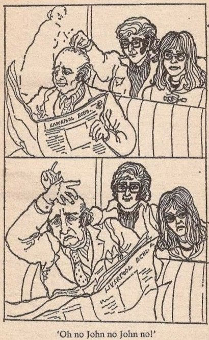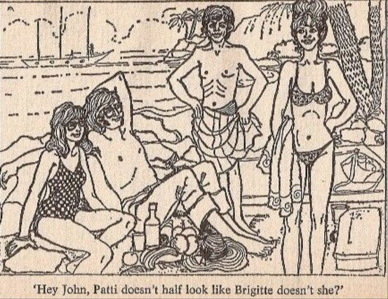 From: 'A Twist of Lennon' (1978). The drawing depicts John and Cynthia (sitting) and Ringo Starr and his wife Patti Boyd. The "Brigitte" mentioned in the text underneath refers to French film star and model Brigitte Bardot.