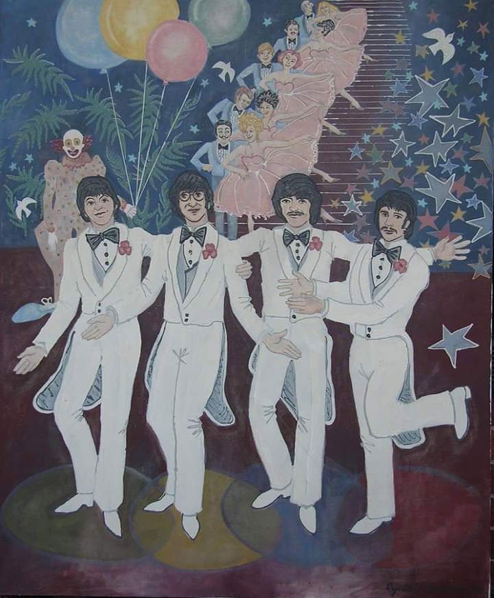 The Beatles going down the staircase during the 'Your Mother Should Know' segment of Magical Mystery Tour. Canvas by Cynthia Powell.