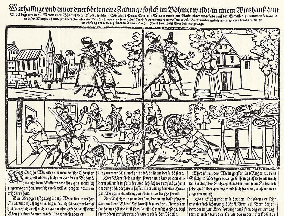 In 1609, the Prager Meister created the woodcut engraving 'Mord in einem Gasthaus im Mährischen Wald zwischen Wien und Prag' ("Murder in an Inn in the Moravian Woods between Vienna and Prague"). The narrative is based on a real-life murder near the Bohemian-Moravian woods. Two men went to an inn, where a bloody brawl broke out, which left two other guests dead. The murderer was later executed by breaking wheel. The Prager Meister visualizes the event in four consecutive panels. To understand the images, one has to read the narration written underneath.