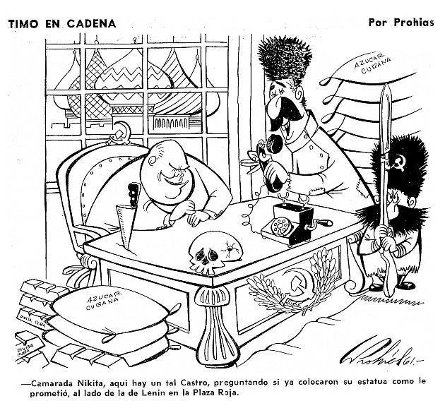 Many of Prohías' cartoons were highly critical of the Cuban dictator Fulgencio Batista, who ruled the island between 1940-1944 and seized power again in 1952. On 1 January 1959, Batista was deposed by Fidel Castro. At first, Prohías was glad about the political changes, particularly since Castro praised his anti-Batista stance. The new leader even personally awarded him a medal. But the new regime soon turned out to be just as repressive. Prohías created a gag comic 'Tovarich' (1959) for Prensea Libra, which starred a Communist tyrant in the Soviet Union. Yet the character looked like Castro and much of the comedy obviously referred to Cuba, rather than Russia. During this period, Prohías also made more straightforward critical cartoons against Castro. Years later, reprints of 'Tovarich' would appear in issue #68 of Mad Magazine (January 1962).