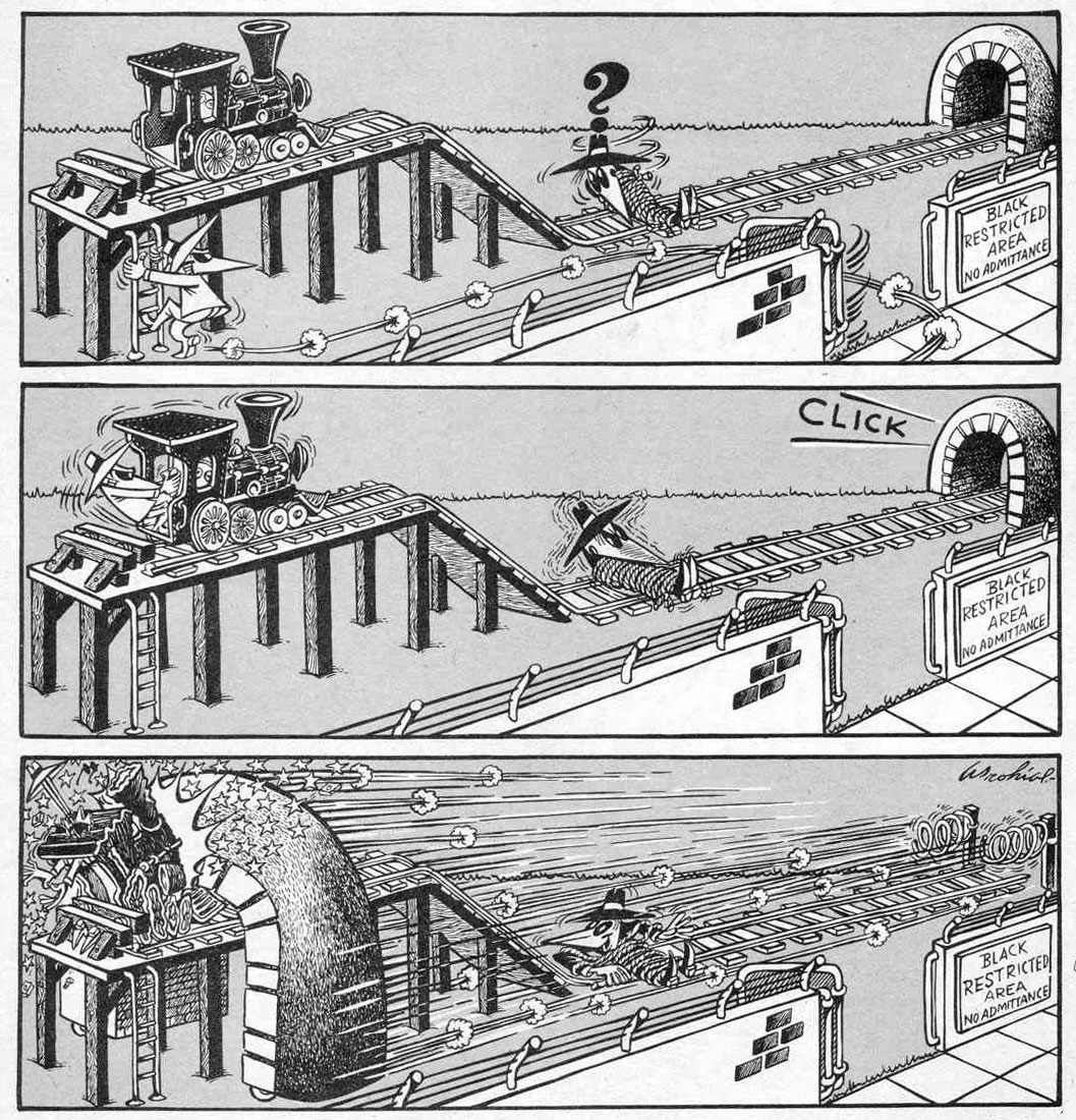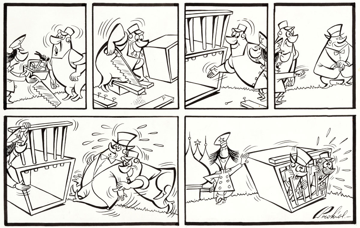 In an interview with the Miami Herald (1983), Prohías noticed the irony that he was once accused by Fidel Castro of being a spy, while now earning money with a comic satirizing espionage. To bring this point across, the credit byline in each comic was never featured in a normal alphabet, but with Morse Code spelling. While 'Spy vs. Spy' is an apolitical comic, it is still a typical product of the Cold War era. Around the time of its debut, espionage scandals dominated international headlines. In 1962, the CIA discovered Soviet missiles on Cuban soil. Diplomatic tensions about its removal led to the Cuban Missile Crisis between the USA and the USSR, which nearly plummeted the world into a nuclear war. Even when the crisis was resolved, it didn't diminish the paranoia between capitalist and communist countries. On a lighter note, spy fiction grew in popularity during the 1960s, thanks to films like 'James Bond' and TV shows such as 'Get Smart', 'I Spy' and 'The Saint'. In that regard, 'Spy vs. Spy' had its finger on the pulse of the era. The comic is a fitting metaphor for the absurdity and paranoia of the Cold War era. The two spies usually spent more time trying to eliminate each other than do useful work. They regard each other as enemies, despite looking and acting almost exactly the same. It was almost symbolic that Prohías retired in 1987, when the Cold War was thawing. Two years later, the Iron Curtain and Berlin Wall were dismantled.