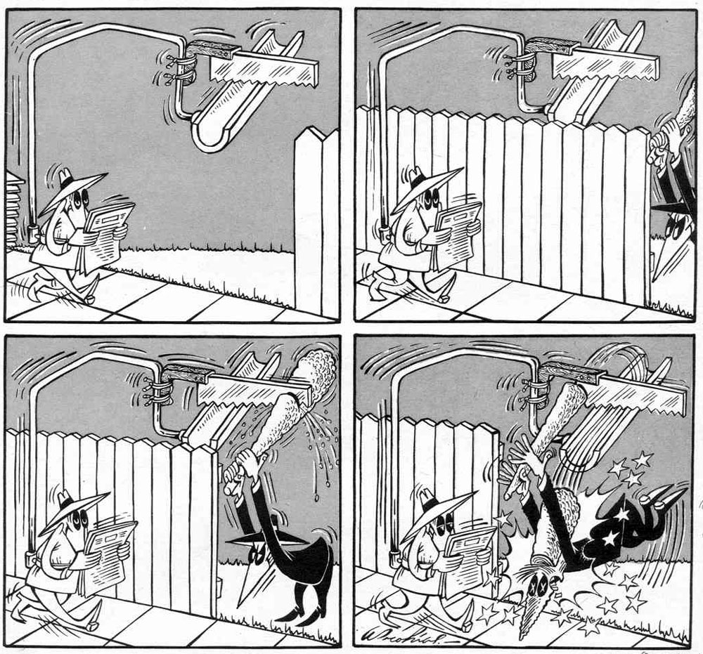 Despite the formulaic set-up, 'Spy vs. Spy' offered clever variations on the characters' never-ending rivalry. Readers could never predict which one would win. Sometimes one of them appears to know what the other is up to, but is still defeated because he didn't see another trap coming. In other episodes, the seemingly defeated spy still manages to come out on top, because he had another trick up his sleeve. Sometimes both spies lose. The series had no other characters, though in issue #73 (September 1962) a female spy dressed in grey made her debut. Prohías used her for a few episodes, but since she usually defeats them both, it made the series too predictable and she was written out.