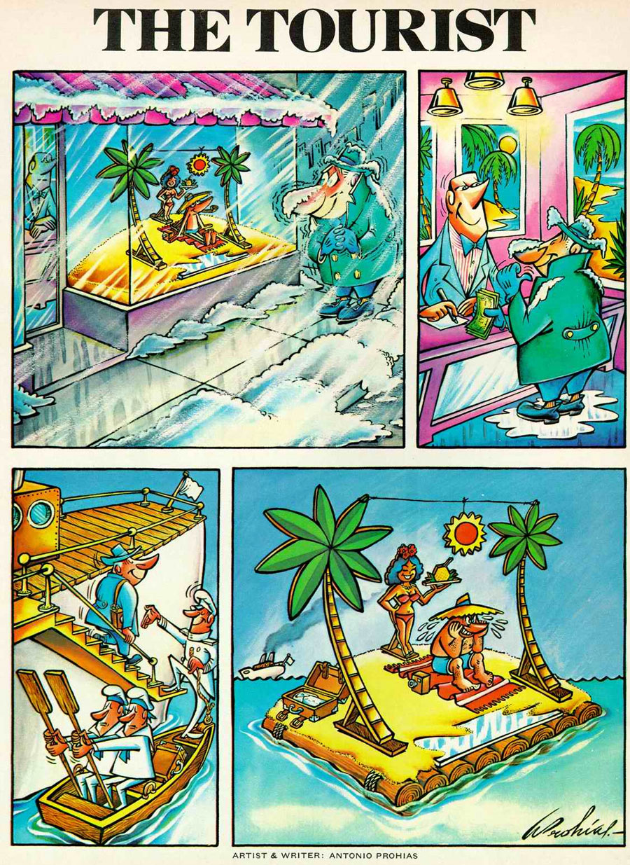 While Prohías remains best known for 'Spy vs. Spy', he created other work for Mad too. He drew various one-shot pantomime gag comics, such as 'A Portfolio of Mad Blooming Idiosyncrasies' (issue #115, December 1967), 'Vengeance' (issue #66, October 1961), 'The Tourist' (issue #150, April 1972), 'The Treasure Map' (issue #159, June 1973), 'The Old Ball Game' (issue #161, September 1973), 'A Witch's Tale' (issue #163, December 1973) and 'On a Safari' (issue #167, June 1974). He also contributed the gag comic 'The Diplomat' to the first Mad Special in the fall of 1970 and 'The Irony of Fate' to the second special (Spring 1971). In the 11th special (Winter 1973), one could read his 'The Photo Contest', while 'The Pearl' appeared in the 16th special (Fall, 1975).