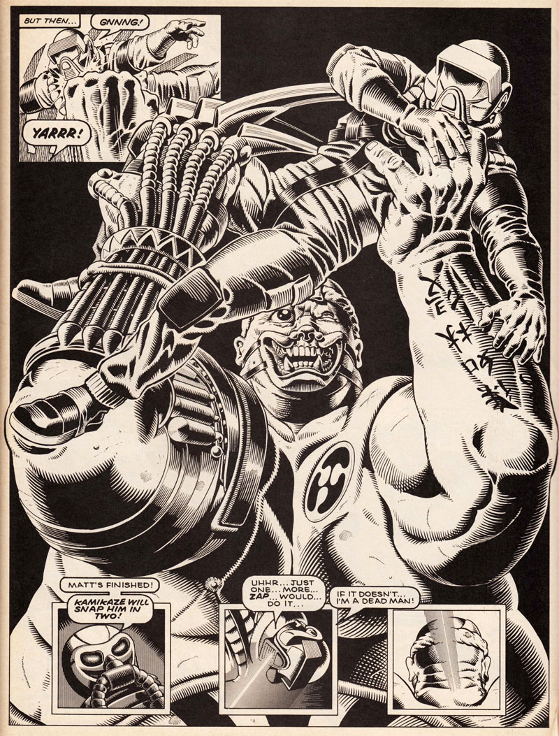 One of Pugh's stories for the 1985 2000 AD Summer Special, 'The Man Who Couldn't Die', motivated editor Barry Tomlinson to offer Pugh a new job at a new magazine. M.A.S.K. was based on the DIC animated TV series and Kenner toy line of the same name, about a special masked taskforce who operate transforming armored vehicles in their ongoing battle against the terrorist organization V.E.N.O.M. The M.A.S.K. magazine started as a fortnightly comic, published by Fleetway, but the TV show proved so popular that it soon became a weekly. Working on storylines like 'Kamikaze', Pugh followed scripts by Peter Milligan and was delighted to receive many M.A.S.K. toys and other merchandise in his mail for him to copy in his drawings. Each issue had five stories, drawn by many anonymous artists, including Juan Escandell, Ian Kennedy, Peter Milligan, Carlos Pino, Kim Raymond, Anthony Williams and Joe Colquhoun.