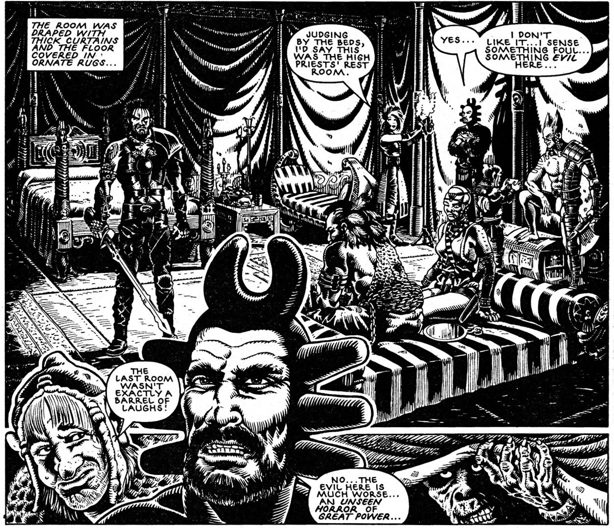 Pugh's breakthrough as a comic artist was drawing the fantasy series 'Sláine' (1985-1986) in 2000 AD. Set in a vague Celtic age, Sláine is a warrior who was banished from his tribe. Together with his dwarf sidekick Ukko and Medb, a woman he rescued from from ritual sacrifice, he roams the country. Many plotlines feature the barbaric hero fighting monsters and his arch nemesis Lord Weird Slough Feg. Scriptwriter Pat Mills was influenced by ancient Celtic myths, like 'Cú Chulainn' and Robert E. Howard's novels about 'Conan the Barbarian', drawn by Frank Frazetta. The earliest 'Sláine' comics were drawn by Angela Kincaid, Massimo Belardinelli and Mike McMahon. Together with fellow artist Glenn Fabry and writer Bryan Talbot, Pugh worked on the narratives 'The Time Killer' (1985) and 'The Tomb of Terror' (1985-1986). He also restyled the series and introduced a new villainous character Elfric, a three-eyed demon with blue skin. He is capable of time traveling and used this to his advantage when helping the ancient Romans invade Britannia and the Vikings plunder Ireland. Pugh also designed the god-like leader Guledig, wizard Myrddin and Murdach, son of real-life medieval Irish king Brian Boru.