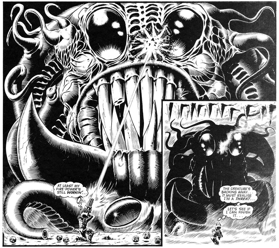 The heavy workload in the advertising industry eventually caused Pugh health problems. Settling down in a cottage in the Welsh town of Aberdare, Pugh went to work in the Creative Services studio of the Thomson Regional Newspapers. After three years, one of the editors asked him whether he wanted to write and draw a comic strip, intended for their weekly newspaper Merthyr Express. The end result, 'Looking Glass Library' (1976), revolved around two children and their dog who find out they can enter the pages of literary classics. This leads to adventures in classic novels like Lewis Carroll's 'Alice Through The Looking Glass', Jules Verne's '20,000 Leagues Under the Sea', Mary Shelley's 'Frankenstein' and the Welsh epic 'The Mabinogion', among other stories. When Thomson brought out a weekly freesheet, The Glamorgan Star, Pugh created another serialized comic for them: 'Captain Classified-Star Ranger' (1979-1981). The superhero character was originally intended to simply sell classified advertising. To boost sales, Pugh was asked to update him, and to give him a sexy assistant, Princess Astra. Pugh based the Captain's design on the 'Judge Dredd' character by Pat Mills, John Wagner and Carlos Ezquerra. Soon afterwards, Pugh became a member of the Society of Strip Illustrators, who offered their members publication space in their monthly newsletter. In these pages, comic writer Pat Mills noticed Pugh's work and invited him to come and work for the adult comic magazine 2000 AD.
