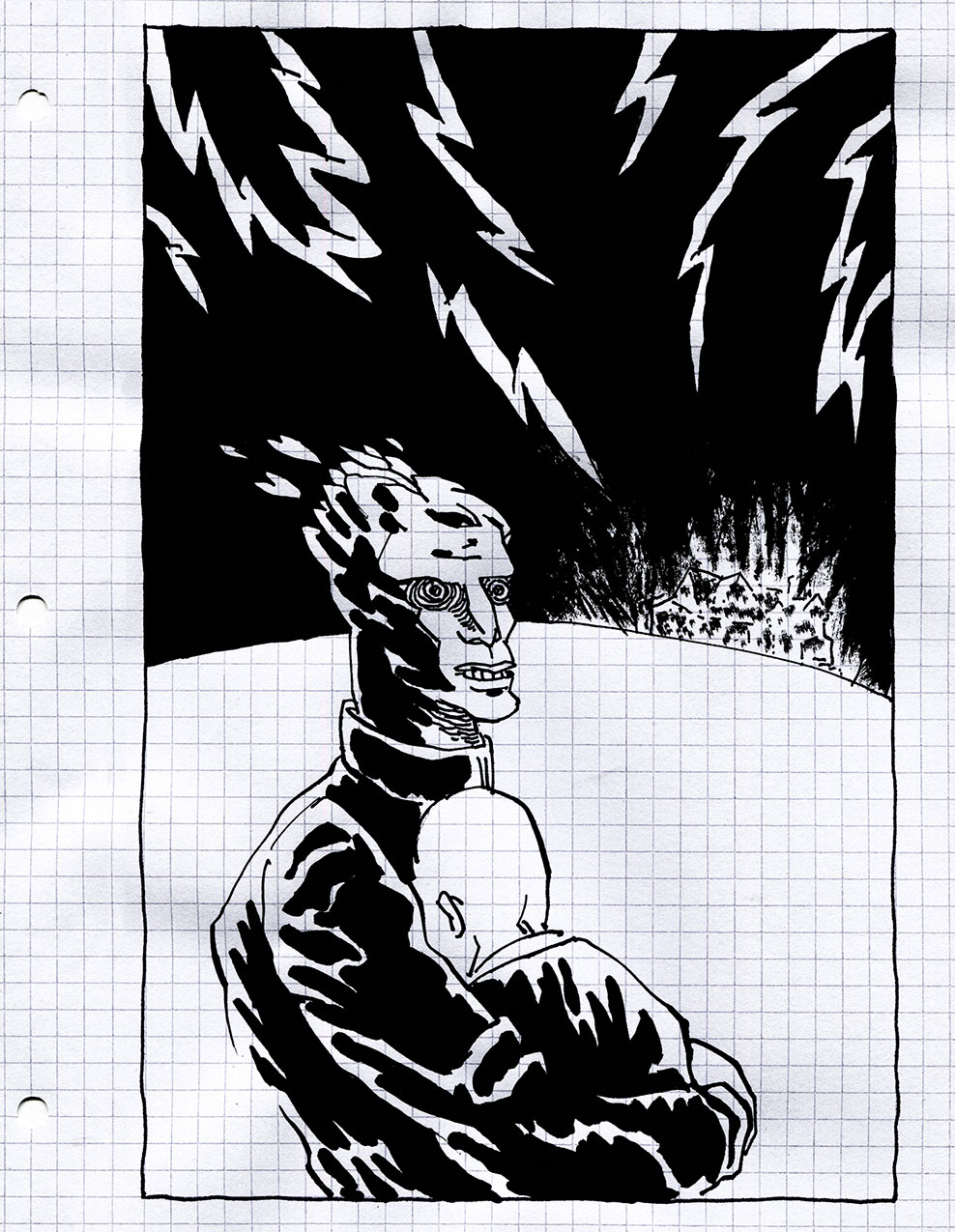 His real name is Jorge Opazo Ellicker, and he was born in 1970 in Buenos Aires. At age six, he moved with his family to Chile, where he got most of his artistic education and did most of his early creative work. He returned to Buenos Aires in 2009. Opazo studied Visual Communication at the ARCOS Professional Institute of Art and Communication (Instituto Profesional De Arte Y Comunicacion) and Fine Arts at the ARCIS University of Art & Social Sciences in Santiago. He has since then been active as a comic artist, painter and visual artist, working for magazines, anthologies and expositions. Later in life he received a Visual Arts scholarship through the German Academic Exchange Service, and attended the Berlin University of the Arts in 2004. He ranks José Muñoz (Argentina), Didier Comès (Belgium) and Vicho Plaza (Chile) among his main graphic influences with regards to comics.