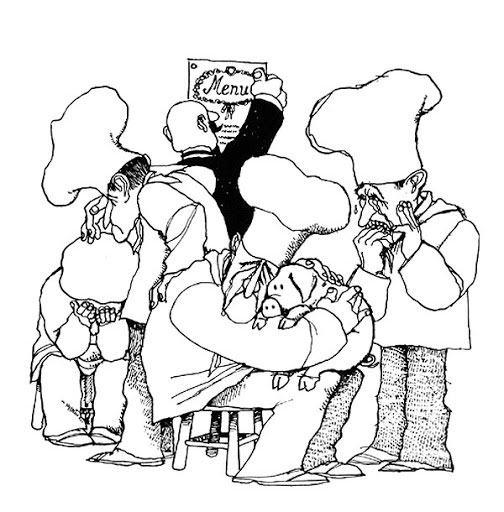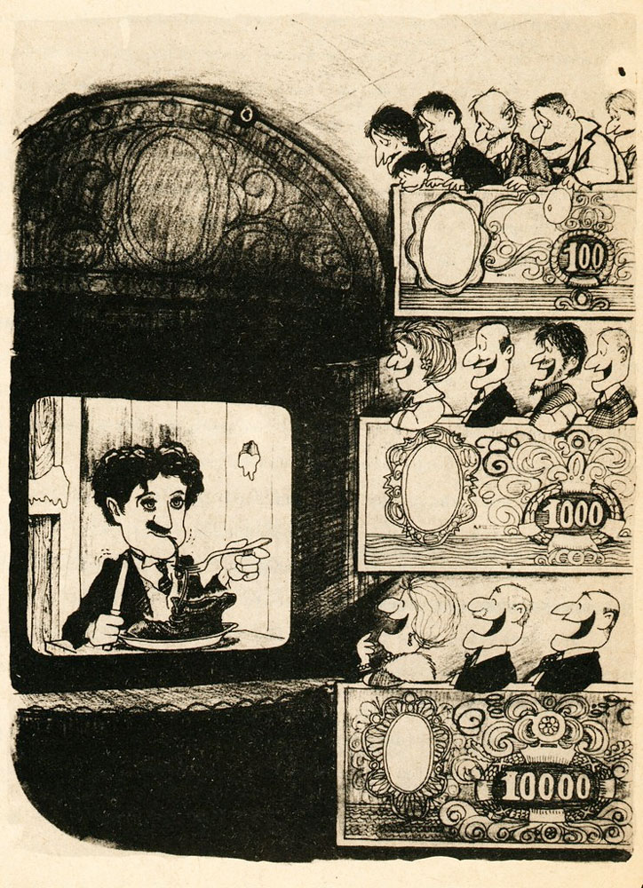 Cartoon by Quino. The people in their money-shaped booths are watching Charlie Chaplin's 'The Gold Rush' and experience it at different levels, literally and figure-of-speech.