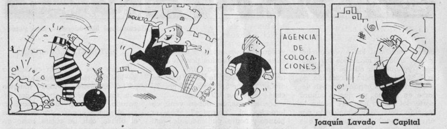 Quino studied art at the Escuela de Bellas Artes de Mendoza, but when his father passed away in 1949, he dropped out and decided to find a job. In 1950, he made his first illustrated advertisement for a fabric store. After his military service, he settled down in Buenos Aires. On 9 October 1954, his first gag comics appeared in the weekly magazine Esto Es, soon followed by work in Leoplán, TV Guía, Vea y Lea, Damas y Damitas, Usted, Panorama, Adán, Atlántida, Che, Democracia, and especially Rico Tipo, Tía Vicenta and Dr. Merengue, where he was the house cartoonist. He married in 1960 and met several future colleagues and publishers during his honeymoon to Brazil. In 1962, he held his first personal exhibition.