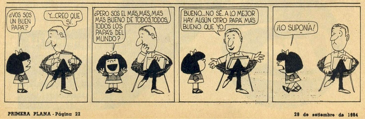 First 'Mafalda' strip of 28 September 1964. Mafalda asks her dad whether he's a good father and "better than all the dads in the world?" He answers he doesn't know whether he's better than all other fathers, but he's certainly good (enough) for her. Mafalda: "I suppose so."