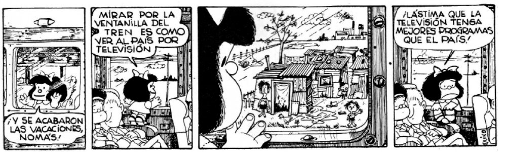 Mafalda is excited to finally see the country she always saw on TV in real life. After witnessing the slums she sighs: "It's a pity that TV has better programs than the country."