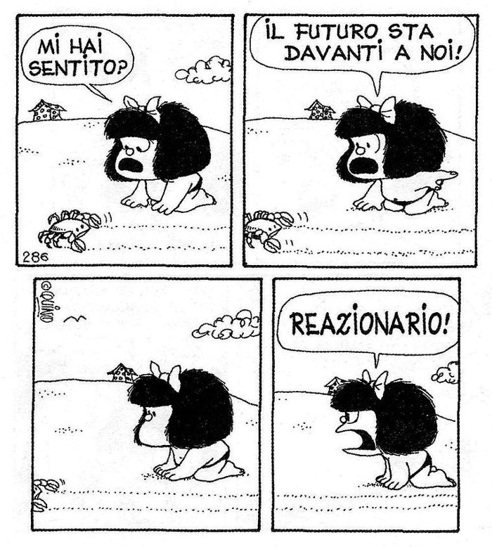 'Mafalda'. Italian-language version. Translation: "Haven't you heard me? The future is ahead of you! ... Reactionary!"