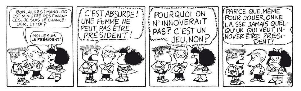 French-language version. Mafalda and her friends play "government". When she wants to be the president Manolito yells: "That's absurd! A woman can't be president!" Mafalda snaps back: "Why don't we innovate? It's a game, isn't it?", whereupon Manolito explains: "Because, even if we're just playing, they would never allow an innovator to be president."