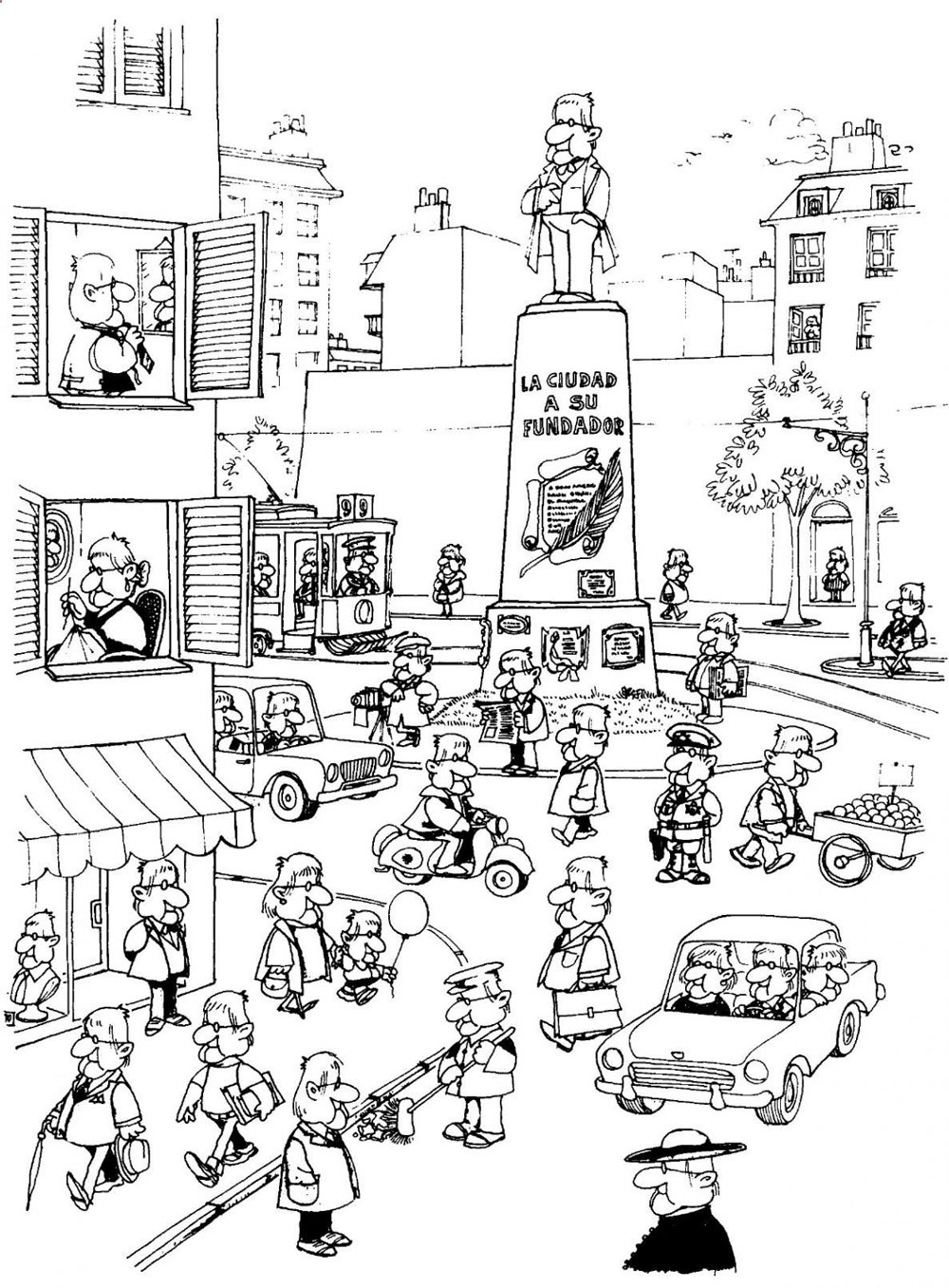 On 29 September 1964, the first episode of 'Mafalda' appeared in the magazine Primera Plana. The editors had accepted his gag comic on the condition that he removed all subliminal advertising. For Quino, this was an easy promise, since he was no longer affiliated with Mansfield. But this didn't mean he would refrain from influencing his readers with unsuspected messages. In hindsight, it's ironic that 'Mafalda' started off as a failed advertising comic, yet was far more successful as a subversive political-social, anti-commercial satire. At first glance, it appears to be a typical children's comic. Mafalda is a young girl who loves pancakes, but despises soup. She enjoys watching Walter Lantz' 'Woody Woodpecker' and listens to The Beatles. Like most six-year olds she can be loud-mouthed, blunt and very impatient. Originally, she and her father Alberto (Papá) were the only recurring characters. Her mother didn't make her debut until 6 October 1964. The family lives in block E, based on a building not far from Quino's own home in the San Telmo neighborhood at Calle Chile 371 in Buenos Aires.