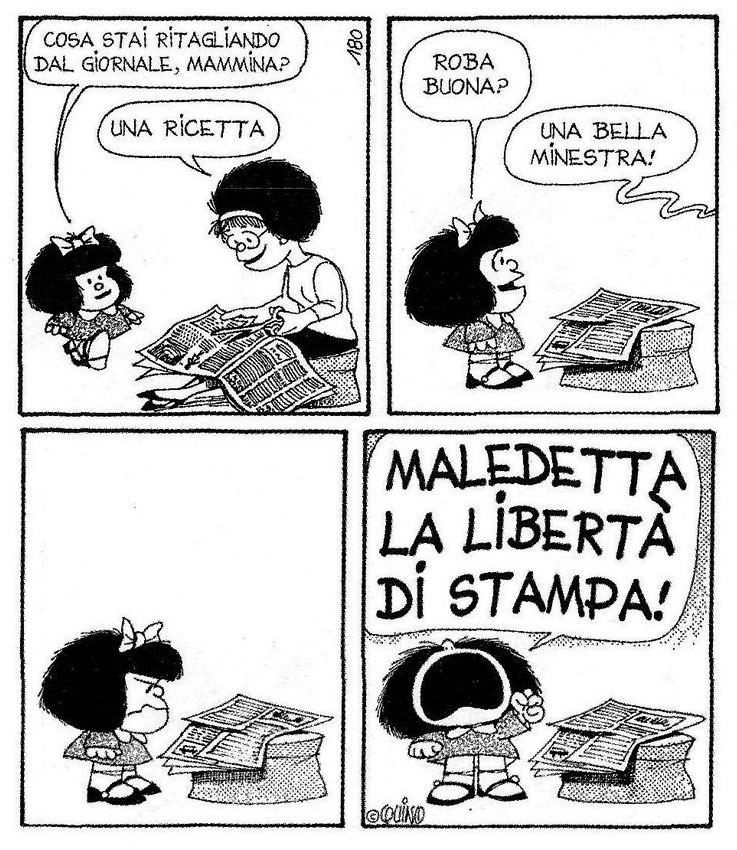 'Mafalda'. Italian-language version. Mafalda asks her mother what she is cutting out from the newspaper? When it turns out to be a recipe for soup Mafalda damns "liberty of the press!"