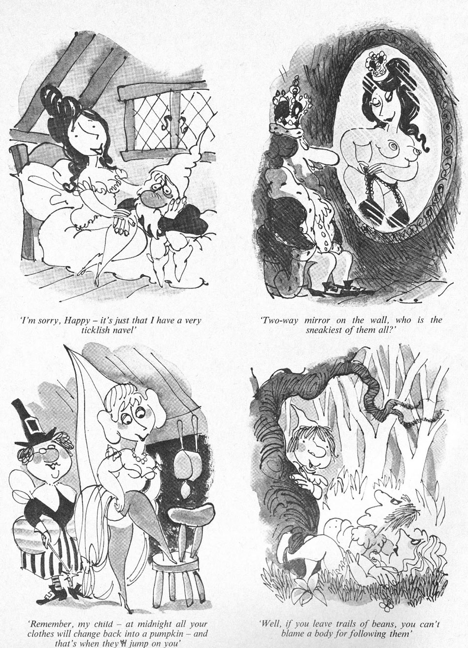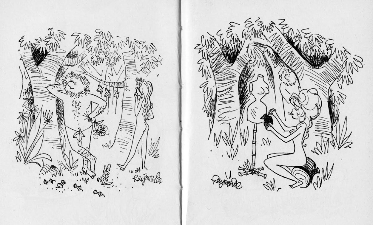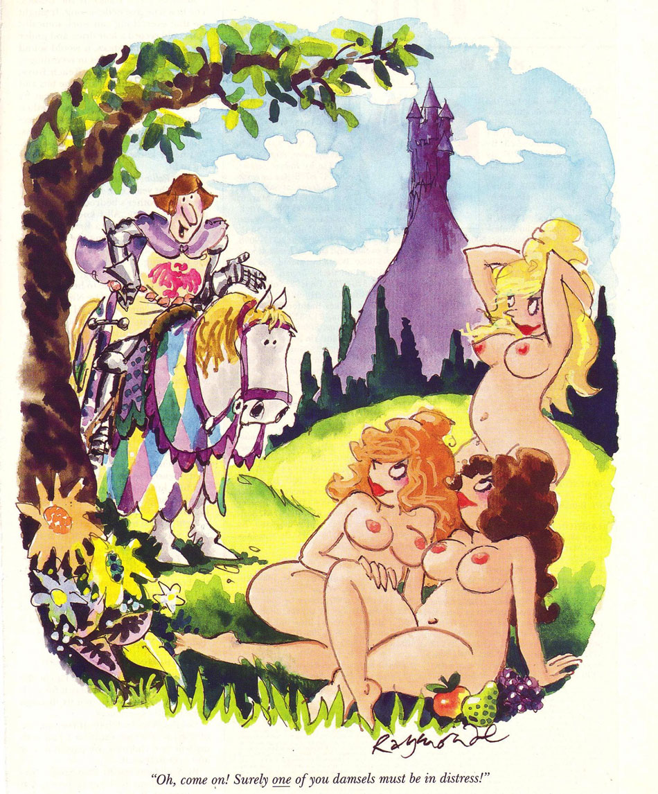 From the mid-1960s until 1972, Raymonde drew erotic one-panel cartoons for the British nudie magazine Mayfair. From 1972 until the late 1990s, his erotic cartoons also ran exclusively in the world's most famous and widespread nude magazine: Hugh Hefner's Playboy. He also created entirely different erotic cartoons for Playboy's German edition. Several of Raymonde's naughty cartoons make literary references. Their characters typically hail from famous fairy tales, nursery rhymes or classic novels.