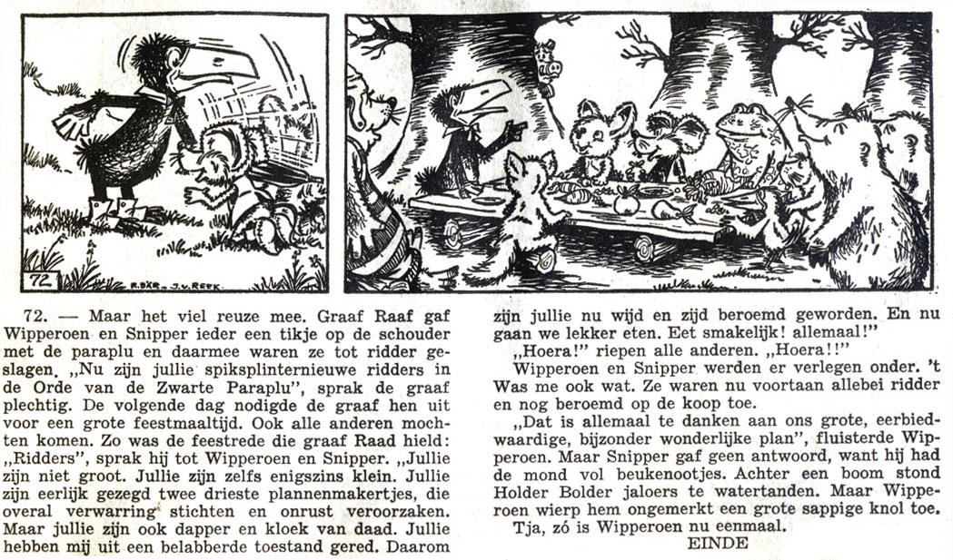 Jan van Reek passed away in 1994. In 2006, he was posthumously awarded the Bulletje & Boonestaakschaal for his contributions to Dutch comics culture, simultaneously with three other veterans of Dutch comics, Raymond Bär, Jan van Haasteren and Willy Lohmann. In that same year, Raymond Bär donated his 'Wipperoen' archives to the Special Collections department of the University of Amsterdam, maintained by Jos van Waterschoot - coincidentally a big 'Wipperoen' fan. Jan van Reek's daughter is illustrator and children's book author Harriët van Reek.