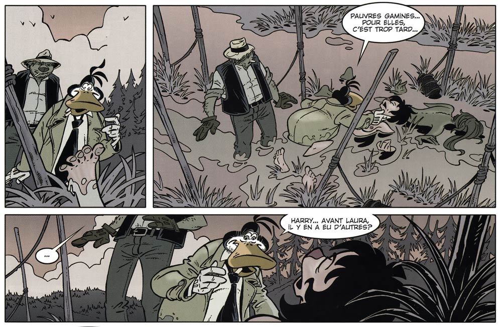 Bringing 'Canardo' into the 21st century, Sokal and Regnauld began experimenting with surprising narratives. In 'Un Misérable Petit Tas de Secrets' (2001), for instance, the weary detective uses a portable time travel device that enables him to solve a heritage mystery. In 'Le Buveur en Col Blanc' (2003), Canardo investigates the mysterious death of a wine critic. With 'L'Ombre de la Bête' (2006), the entire story takes place on a tourist bus, hijacked by a terrorist. Canardo's family background was also further explored, with some of his child nephews appearing in stories like 'Le Voyage des Cendres' (2010) and 'Le Vieux Canard et la Mer' (2013). New recurring characters joined the cast too. In 'La Fille Qui Rêvait d'Horizon' (1999), the medical examiner Doc Fatty made his first appearance. Doc Fatty is an eerie-looking bulldog with thick glasses, but nevertheless very good at his job. His autopsies often provide Canardo with new clues about his cases. In 'La Fille Sans Visage' (2009), the royal couple of the mini state of Belgambourg is introduced. The cigar-smoking grand duchess and her equally shady husband are involved in all kinds of corrupt intrigues. Their country looks like Monaco, but its name is a contraction of Belgium and Luxembourg. Sokal and Regnauld also managed to shock long-time fans. In 'La Mort aux Yeux Verts' (2016), Canardo's good friend Inspector Garenni is murdered.