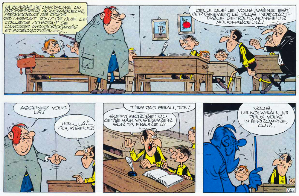 Along the way, Remacle grew bored with his daytime job. A new opportunity rose in 1955, when the publisher of Le Moustique, Charles Dupuis, noticed his talent. He offered him a job in the art studios of his publishing house, where Remacle was mainly involved in lettering the Dutch translations of comic series published in Spirou for Robbedoes. At the studio, he became friends with his colleagues Willy Lambil and especially Marcel Denis, with whom he would frequently collaborate in the following years. Other co-workers were Arthur Piroton, Louis Salvérius, Jamic, Turk and Eddy Ryssack. Studio head Maurice Rosy can be considered Remacle's first artistic mentor. On 23 February 1956, Dupuis' new tabloid-sized comic magazine Risque-Tout ran Remacle's first comics story: 'Le Mousquetaire'. The main character, a kid called Rouquinet, showed a strong resemblance to Hank Ketcham's 'Dennis the Menace'. For his further comics work, he settled in the publisher's house style, the round-nosed and primarily humorous "School of Marcinelle". He initially found inspiration in the work of Raymond Macherot, but later on Remacle's major influence was evidently Morris.