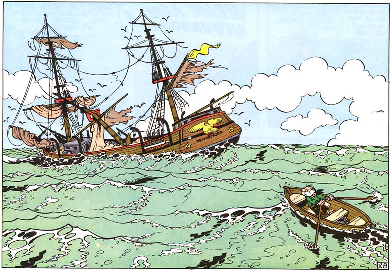 Throughout its run, humor remained the driving force behind the stories of 'Le Vieux Nick et Barbe-Noire'. Some exceptions aside, the plots of the stories generally served as vehicles for an ongoing spree of gags and slapstick charades. The graphics were also fully in service of the humor. The backgrounds were kept simple, although Remacle took great care in depicting ships historically accurately. The artist was a connoisseur of naval history, which he at times incorporated in his stories. One of the early episodes, the fan favorite 'Les Mangeurs de Citron' (1959), was partially inspired by the famous mutiny on the Bounty (1789) and delved into the deplorable hygienic circumstances 18th century sailors had to work in. In the late 1970s he made a couple of short stories in which Barbe-Noire tells about life at sea, collected in the album 'Sous les Voiles' (1979).