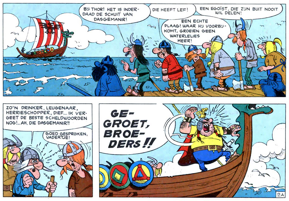 Instead, Remacle and Denis teamed up to create their own hero: the viking 'Hultrasson' (1964-1967). He was first introduced to readers in Spirou issue #1351 (5 March 1964). Characterized by a touch of fantasy and the same wacky humor as 'Le Vieux Nick', the series stars a viking in the service of King Harald-les-Beaux-Cheveux ("King Harald-with-the-Beautiful-Hairs"). Hultrasson is constantly crossed on his missions by the evil barbarian Sépadeffasson, who is destined to overthrow King Harald. Sépadeffasson's servant is the sly Payasson, whose looks were based on Spirou's editor-in-chief Yvan Delporte. To share the workload, the stories were penciled by Remacle and inked by Denis, while Vicq took care of the scriptwork for the episodes 'Fais-moi peur Viking' (1964) and 'Hultrasson chez les Scots' (1965). When the rather unreliable scriptwriter suddenly disappeared, Maurice Tillieux wrote the third story, 'Hultrasson perd le nord' (1966). In that same year, Remacle and Denis made two short spin-off stories starring Sépadeffasson. A temporary fall-out between the two artists ended their collaboration, and Remacle sold his share of the rights to publisher Dupuis. Denis made one more short story in 1967, but it took until 1973 before the series briefly returned. The fourth serial, 'L'Eau de Politesse', was once again scripted by Tillieux, but this time drawn by Vittorio Leonardo.