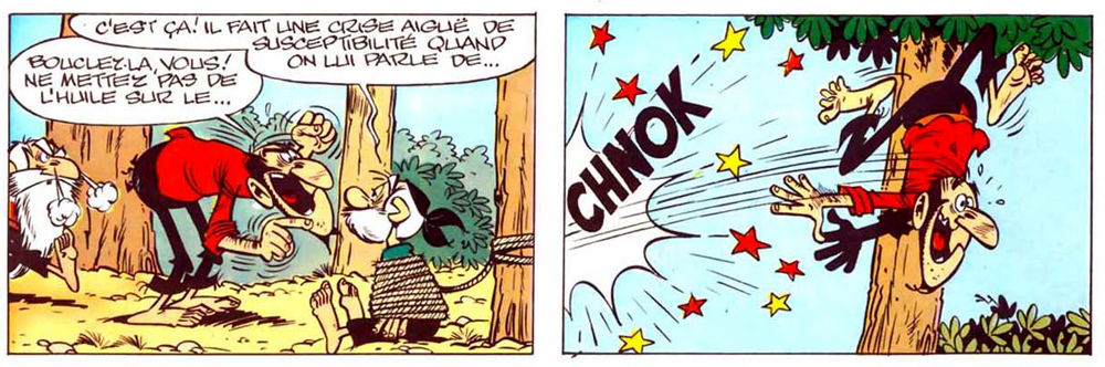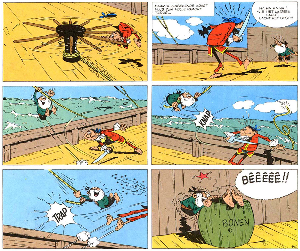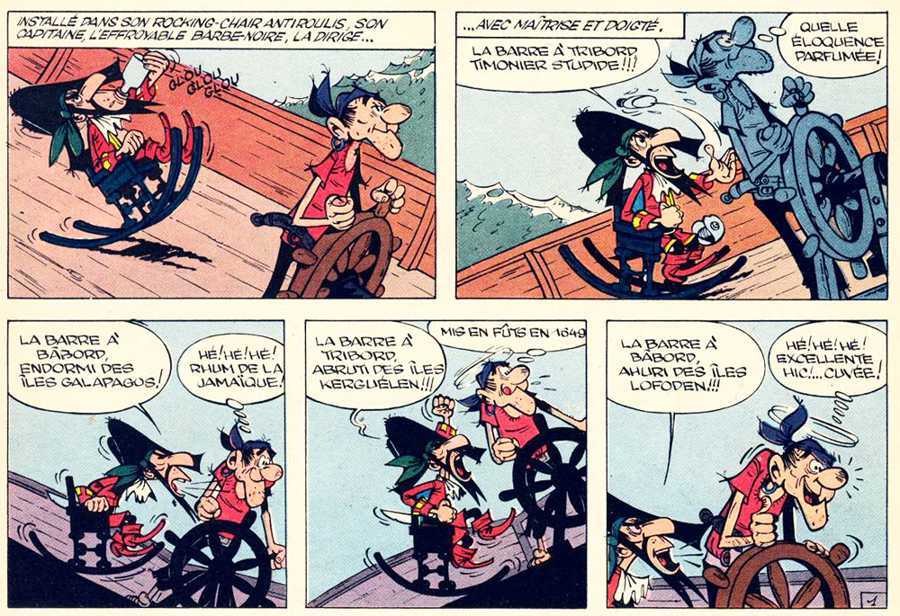 Full of energy, the old man led his crew on missions against pirates for decades to come. In the story 'Dans la Gueule du Dragon' (1961) the lisping harpooner Sébastien became Nick's regular sidekick. Old Nick's appearances in his own series however became more and more scarce over the years. His role at the center stage was gradually taken over by his arch enemy. The pirate Barbe-Noire (real name Saturnin Tromblon) was introduced in the fourth story, 'L'Île de la main Ouverte', serialized in Spirou from 24 March 1960 on. Despite the name, Remacle's "Blackbeard" shows very little resemblance to his historical namesake. Grumpy, highly volatile and plagued by a childish nature, the pirate's antics hardly lead up to anything, especially since Vieux Nick continues to cross his paths. This all to the despair of his grandpa ("Bon-Papa"), who envisioned his grandson to become the greatest pirate of all. Introduced in 'Les Mutinés de la Sémillante' (1960), Bon-Papa accompanies Barbe-Noire on all his missions, regularly slapping his offspring with a "corrective tap". As Remacle gradually began to draw Barbe-Noire taller, the pirate's wits quickly diminished. In the end, the interactions between Bon-Papa and his grandson bring to mind Joe and Averell Dalton from Morris' 'Lucky Luke' series.