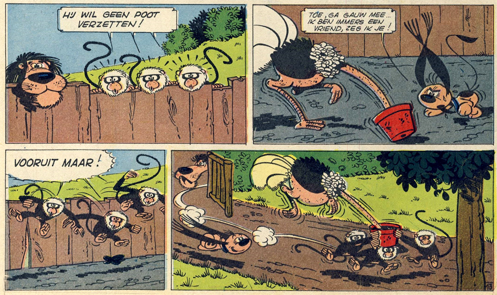 More durable was the cute little dog 'Bobosse' (1956-1958). He made his first appearances in a couple of gag strips, discreetly filling empty spots on the pages of Spirou between February and August 1956. A short story was published in Risque-Tout #19 of 29 March 1956. Bobosse's first long adventure, 'La Forêt Silencieuse' was serialized in Spirou between 30 August 1956 and 17 January 1957. By now, the little dog had found its definitive form, with his excessively long tail and ears. The countryside adventure in which Bobosse and his badger friend investigate the disappearance of several forest animals however didn't amount too much. Chief editor Yvan Delporte decided to help him out with the script for the next story, together with Peyo. 'Les Évadés de Trifouillis' appeared between October 1957 and March 1958, and dealt with the escape of mistreated animals from a menagerie. Despite the better script, the story suffered artistically. Not a fully trained artist yet, Remacle had difficulties with effectively portraying animals. Thus came an end to the adventures of Remacle's first character, although 'La Forêt Silencieuse' appeared in a remounted version in the pocket book collection 'Gag de Poche' in 1966. By then, Remacle had already become one of the staples of Spirou with a completely different series.