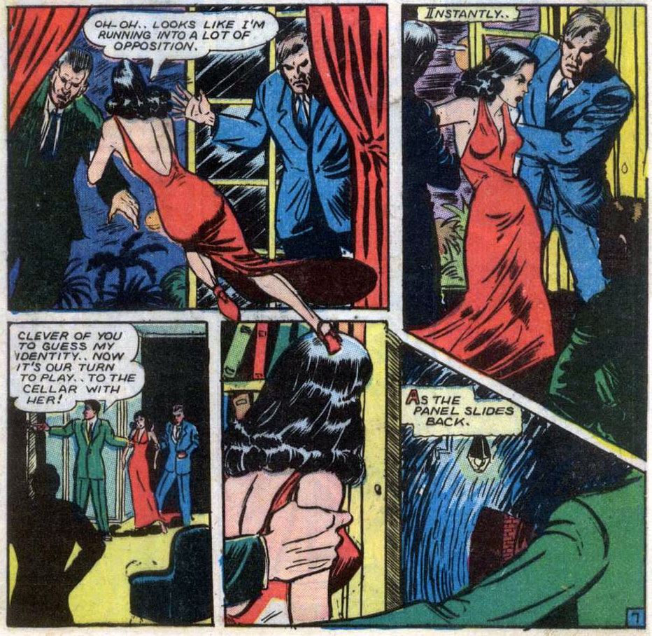 Following the success of their 'Sheena Queen of the Jungle' feature - created in 1938 by Will Eisner and Jerry Iger - Fiction House had focused on producing comic books starring pin-up girl heroes. Having an interest in costume design and background in the fashion industry, Lily Renée became a prominent artist of such features. With her delicate line art, she drew beautiful heroines in elaborate dresses and costumes, while her talent for storytelling allowed her to use effective camera angles and elegant page layouts. In addition, her knowledge of German Expressionists like Gustav Klimt and Otto Dix gave her the opportunity to add mood and mystery to her panels. Since she signed her work with "L. Renée", Lily Renée often received fan letters addressed to "Mr. Renée".