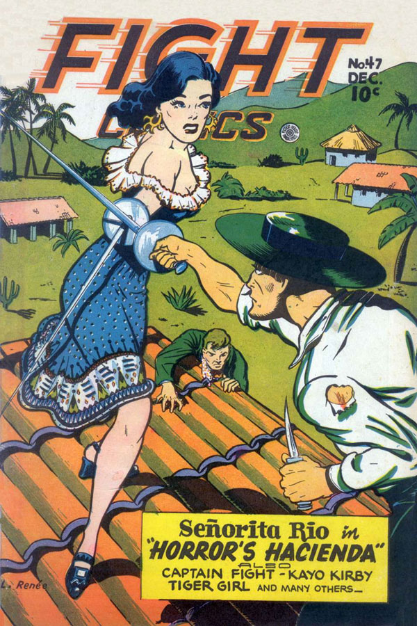 The Fiction House character Lily Renée is mostly associated with is 'Señorita Rio' (1944-1947). Appearing in Fight Comics, Señorita Rio is the secret identity of Hollywood movie star Rita Farrar, who signs up to become a spy and Nazi hunter after her husband is killed during the attack on Pearl Harbor. Thanks to her Hispanic heritage, she can go on secret missions to hunt down Nazis and other villains in South America without attracting attention. Like other features she did for Fiction House, Lily Renée was not the originator of 'Señorita Rio' - that was Nick Cardy in 1942 - but her elegant work on the feature eventually defined the character.