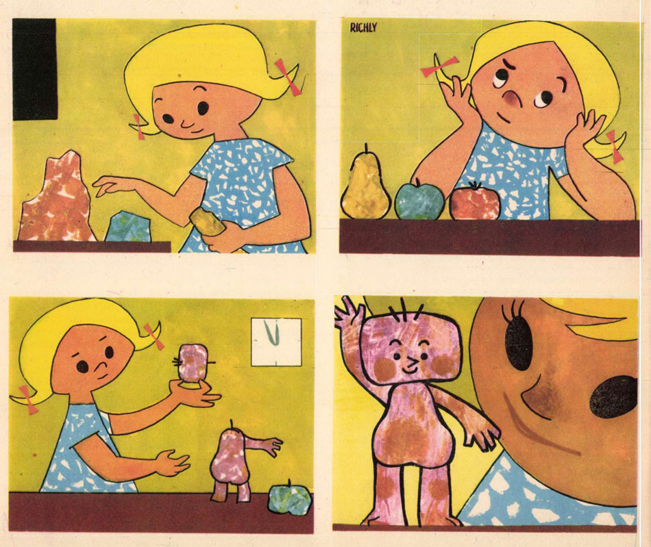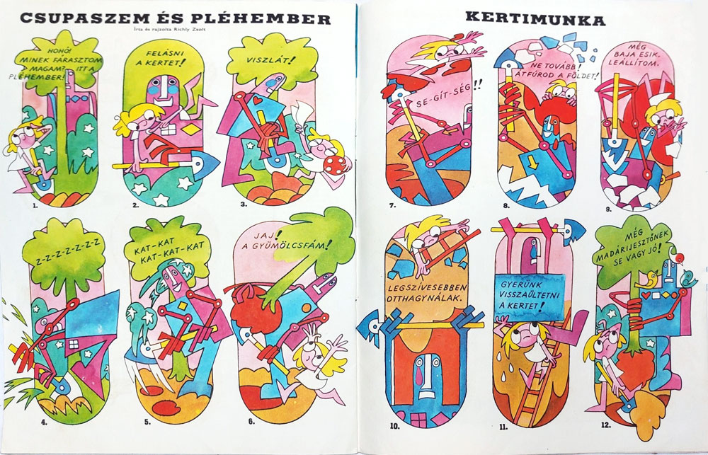 While still a student, Richly additionally worked as an illustrator and comic artist for youth newspapers and magazines, an activity he continued at times during his later animation career. Between 1962 and 1966, he drew a largely pantomime comic feature called 'Gyurma Gyuri' for Kisdobos, the children's magazine of the Association of Hungarian Pioneers. The main character was a toy made from plasticine by a little girl. Later in the series, additional characters were added, such as Gyurma Kati (a plasticine girl) and Gyurma Csiga (a plasticine snail). Returning to the magazine in the 1970s, Richly created the feature 'Négyszem' (1971-1978), literally meaning "Four Eyes", about a little girl with glasses. In the final episodes, printed in 1977 and 1978, the character appeared without glasses and was for the occasion renamed to 'Csupaszem', meaning "Bare Eye".