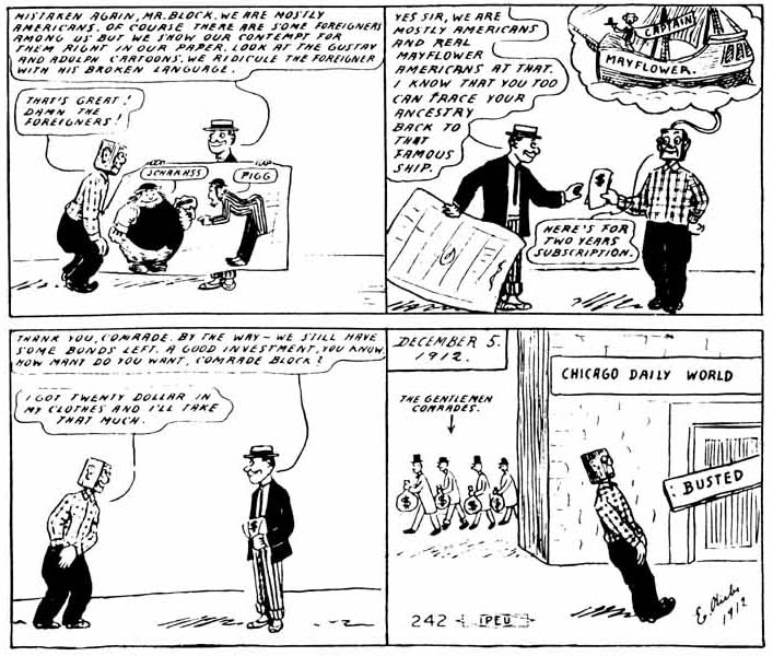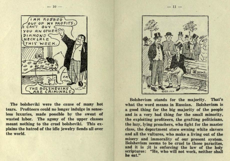 In 1919, Ernest Riebe wrote, illustrated and published a book about the Russian Revolution of two years earlier, called 'Crimes of the Bolsheviki: Dedicated to the Interests of the International Proletariat' (1919). It follows the same format as a text comic, with text captions underneath the images, although some panels also feature speech balloons. The title itself is misleading, since the "crimes" Riebe mentions are all sarcastic and thinly veiled praises of Bolshevism. In the final pages, Mr. Block has a cameo and the constitution of the Soviet Union is presented in full.