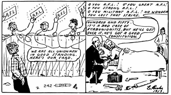 Not much is known about Ernest Riebe's life. He was presumably born in Germany in the late 19th century, immigrating to the United States at an unknown date. It is known that by the early 1910s, he lived in Minneapolis, Minnesota. In 1912, Riebe was writing and making cartoons for The Industrial Worker, the official newspaper of The Industrial Workers of the World (IWW). He remained a loyal member of this union and its publication until 1922. Since the IWW was a non-profit organization, Riebe was never paid for his contributions. But he could at least be as political as he wanted, without fear of censorship. No other newspaper cartoonist at the time could even dream of such creative freedom. Other cartoonists and illustrators who worked for IWW publications were Thomas J. Hagerty, Joe Hill, Joe Troy, Ralph Chaplin, Dust Wallin, Ern Hanson, Fred Jerger, Eugene Barnett, William Ekman, De Moi, OK, Pashtanika, J.A. Van Dilman, F. Vose, William Henkelman, Cliff Bennett and L. Stanford Chumley. And these are merely the ones who signed their work.