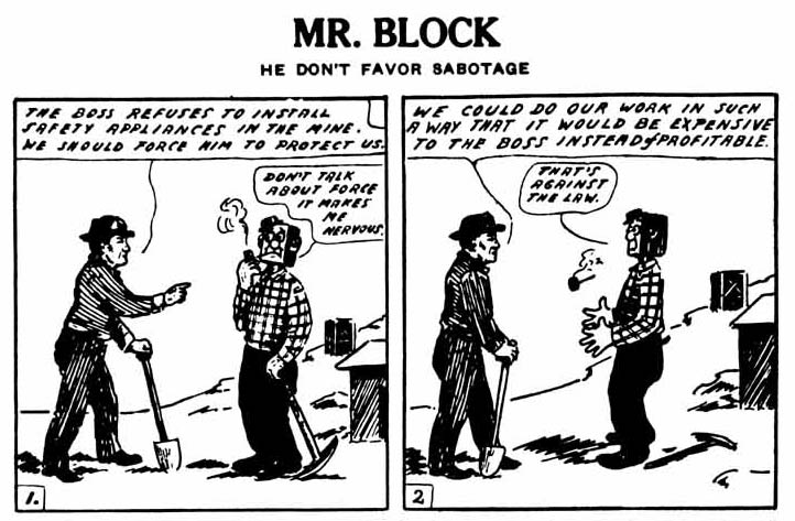 In 1913. 24 episodes of 'Mr. Block' were compiled into a comic book, which The Industrial Workers of the World distributed across the country. In 1919, a follow-up was published, 'Mr. Block and the Profiteers'. At the time, the character was notable enough for American folk singer Joe Hill to write a song about him, in which he complains about the way common workers are exploited. Riebe also adapted 'Mr. Block' into a stage performance.