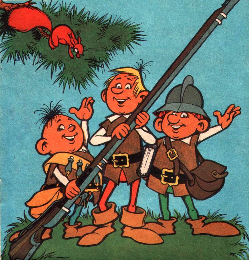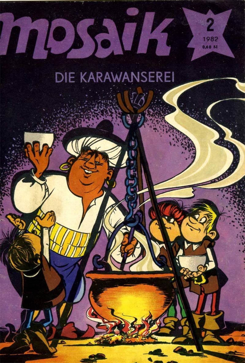 When in 1975 Hannes Hegen broke his ties with the publishing house Verlag Neues Leben, he took the rights of their hit comic series 'Digedags' with him. Scriptwriter Lothar Dräger quickly developed new lead characters for their magazine Mosaik, which were graphically designed by Rietschel and became known as 'Die Abrafaxe'. They were introduced in the first issue of 1976. Although obviously similar to 'Digedags', 'Die Abrafaxe' were in one way an improvement. The 'Digedags' had always been rather one-dimensional and interchangeable characters. Rietschel therefore gave 'Die Abrafaxe' more distinctive personalities and actual names: Abrax, Brabax and Califax. The trio travelled the world and through the time, initially serving as companions to jesters and other folk characters such as Harlequin, Hodscha Nasreddin, Ludas Matyi and Eulenspiegel. While the Abrafaxe's help for ordinary people against feudal rulers could be interpreted as falling in line with the DDR's official communist propaganda, it was otherwise a straightforward, apolitical children's comic, like most of Mosaik's other content.