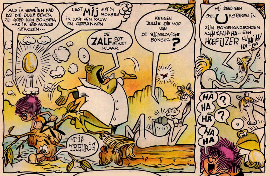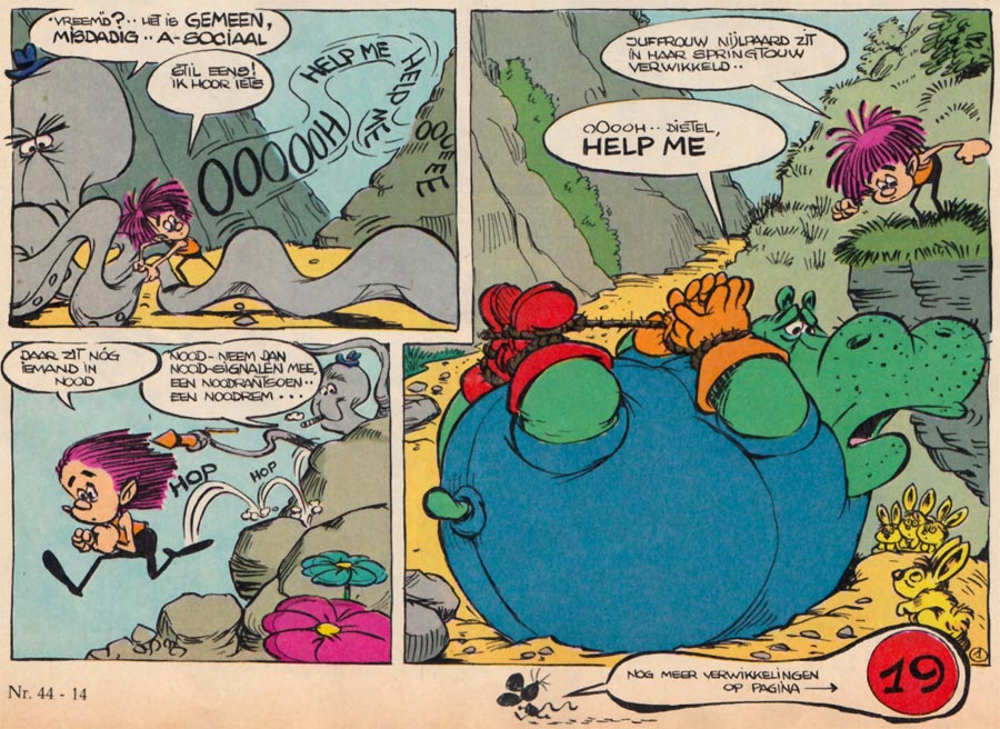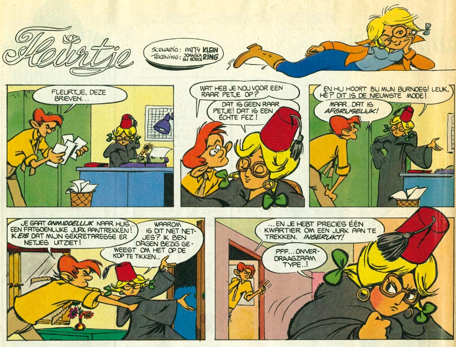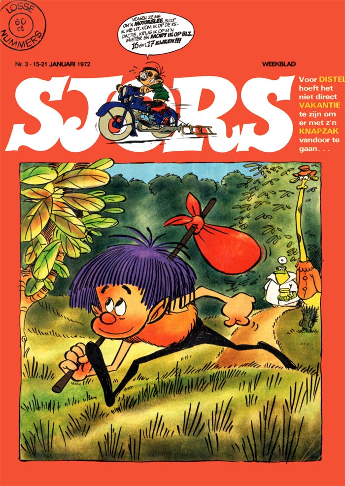 Although mainly an animator, Børge Ring also worked on comics in the 1970s and 1980s, the majority in close collaboration with his wife Joanika. While still working for Toonder, Ring collaborated with one of Toonder's scriptwriters, Lo Hartog van Banda, on the comic strip 'Distel' (1970-1974). It debuted in Sjors magazine in late 1970 and starred a strange-looking boy with purple hair, who lived in a fantasy jungle with talking animals. Banda left the comic in 1972, after which Patty Klein wrote four more stories until 1974. Through Toonder, Klein and the Rings additionally co-created various stories about the anthropomorphic cat 'Pelle Svanslös' (an original creation by Gösta Knutsson) for the Swedish publishing company Semic Press. On a freelance basis, the trio made the back cover gag strip with the misadventures of madcap office girl 'Fleurtje' (1973-1974) for the girls' magazine Tina.