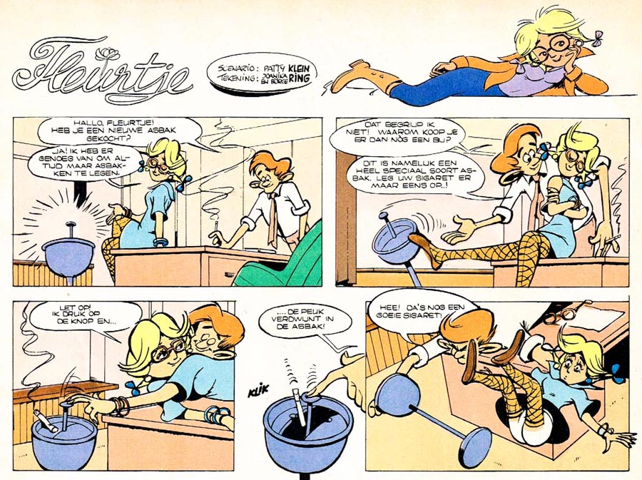 In 1973, Joanika encouraged her husband to become a freelancer, so he could choose his own projects. Besides animated shorts, these also included several comics for the children's magazines of the VNU publishing group. Joanika served as either inker, letterer and colorist on most of these productions. For the Dutch children's comic magazine Sjors, they made the fantasy comic 'Distel' (1970-1974, scripted by Lo Hartog van Banda and Patty Klein) and the slapstick humor comic 'Kobus en Kachelmans' (1973-1974, scripts by Piet Hein Broenland). For girls' magazine Tina, they drew the back cover gag strip with madcap office girl 'Fleurtje' (1972-1974, scripts by Patty Klein). For 'Kobus en Kachelmans' and 'Fleurtje', Joanika additionally took care of most of the backgrounds, while her smooth inking line also turned out useful for the Dutch production of Disney stories. In the period 1973-1980, she inked pencil art by former Toonder colleagues Ed van Schuijlenburg and Frits Godhelp for stories with characters such as 'Brer Rabbit' and 'Little Hiawatha'. Additionally, she also helped her husband Børge Ring with his Disney stories. When the original artwork for the Carl Barks story 'Sheriff of Bullet Valley' wasn't available for a Dutch publication and translation in 1976, Joanika Ring re-inked the pages.