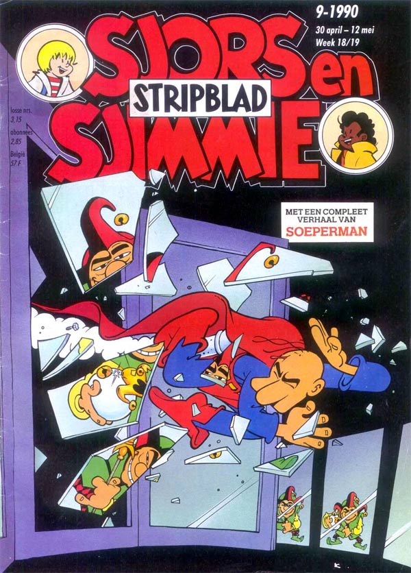 'Soeperman' appearing on the cover of Sjors en Sjimmie Stripblad (September 1990), and a book collection of 'Stanley'. Cover art by René Uilenbroek.