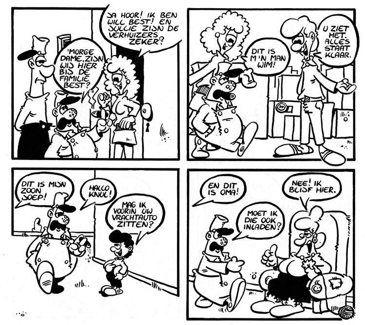 Still in 1983, Ritstier was present in Robbedoes on a more regular basis, as the magazine had just launched its own separate section for Dutch and Flemish artists, apart from the French-language parent magazine Spirou. Running in a corner of one of the editorial pages, Ritstier's gag strip 'Bartje' (1983-1985) featured a clever and cheeky little boy with a giant cap, accompanied by his philosophical dog Kwibus and cocky parrot Lou. In 1985, Bartje continued as a daily strip in the local newspapers of the Sijthoff Press Group (Rotterdams Nieuwsblad, Haagsche Courant, Goudsche Courant). A collection of 'Bartje' strips was published by Loeb in 1986. During its final years, the 'Bartje' newspaper strip was "ghosted" by Leo Immerzeel.