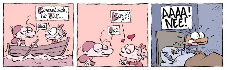 'Flip'. Translation: Flip is horrified about his nightmare... being kissed by a girl!