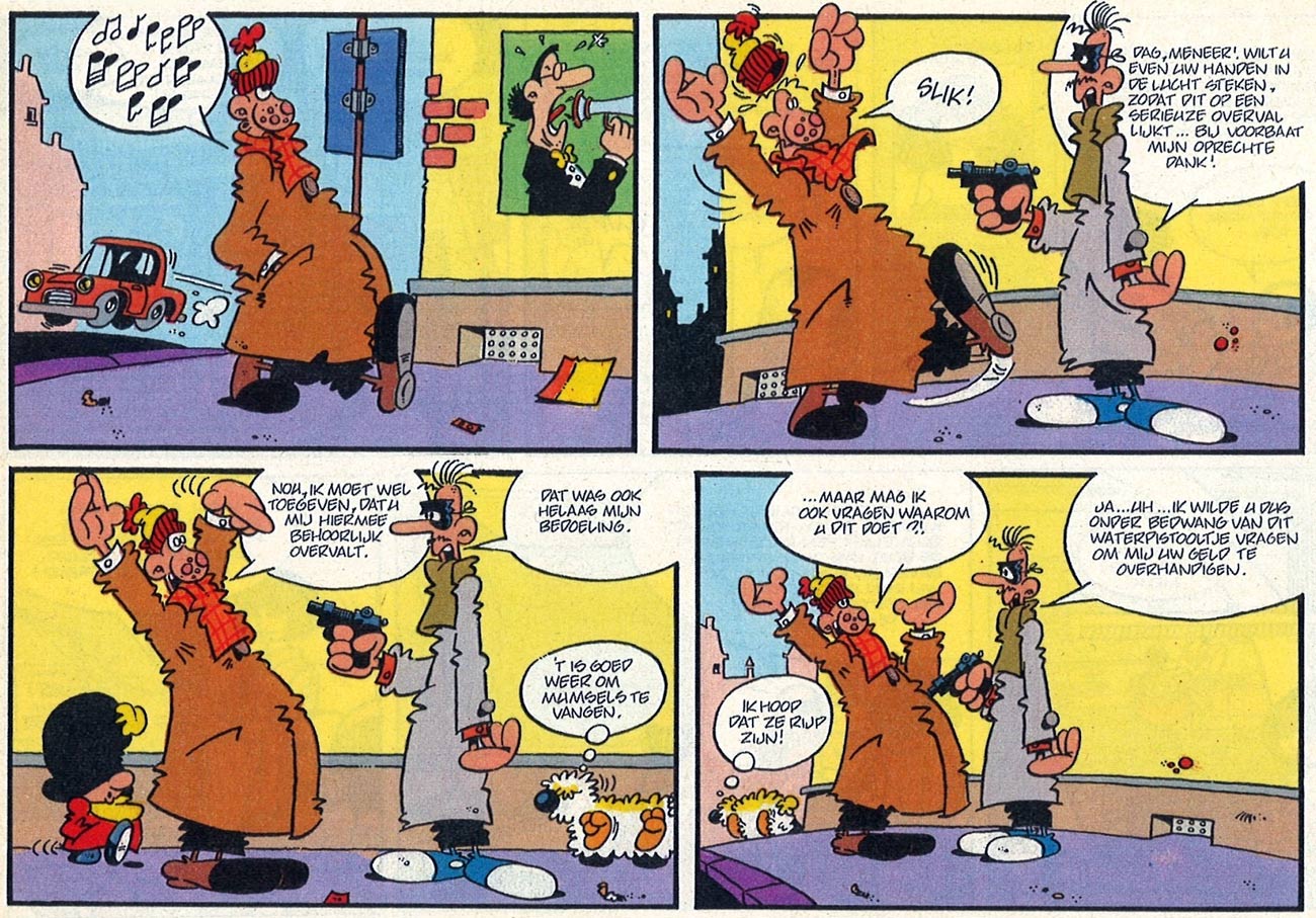 Ritstier's corny slapstick stories about the incompetent criminal and layabout 'Harry Lipwitts' (1984-1986) ran in the comic magazines Robbedoes (1984-1985) and Eppo/Wordt Vervolgd (1985-1986), before continuing from 1987 into the early 1990s as a newspaper comic in Leeuwarder Courant. Each episode shows the zany lazybones strolling the streets, encountering all kinds of corny and absurd events.