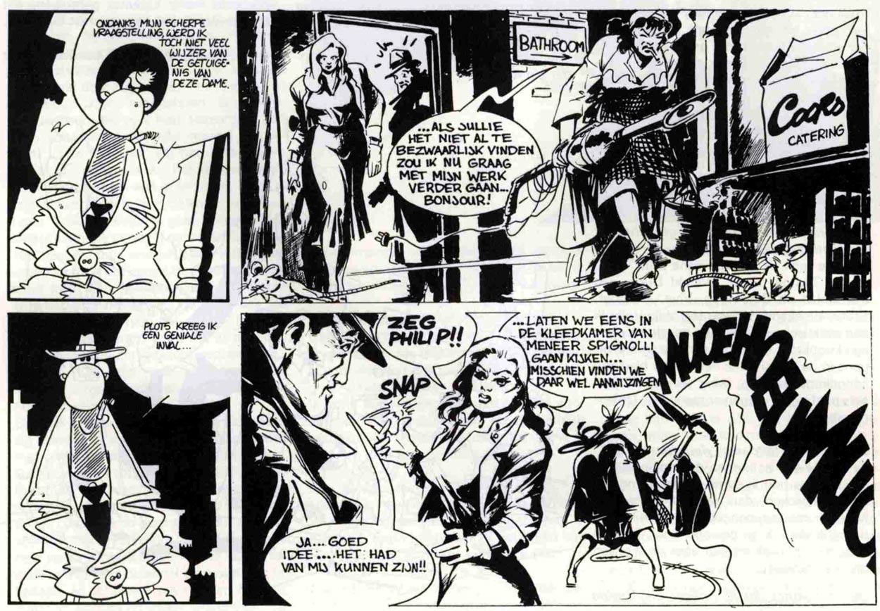 As a scriptwriter, Ritstier was for decades closely associated with the artist Minck Oosterveer. After their editorship of Yèch, they collaborated on many comic series until Oosterveer's untimely death in 2011. An early creation was the clumsy private investigator 'Philip J. Boogaard' (1984-1985), his name an obvious reference to film noir actor Humphrey Bogart. Most adventures ran in the Saturday newspapers of the Sijthoff group, two additional ones were published in the 1985 and 1986 'Suske en Wiske' holiday books. As a true joint effort, Ritstier wrote the scripts and drew the caricatural segments, while Oosterveer took care of the realistic parts of the artwork. After that, Ritstier and Oosterveer established a more traditional working relationship as writer and artist, respectively.