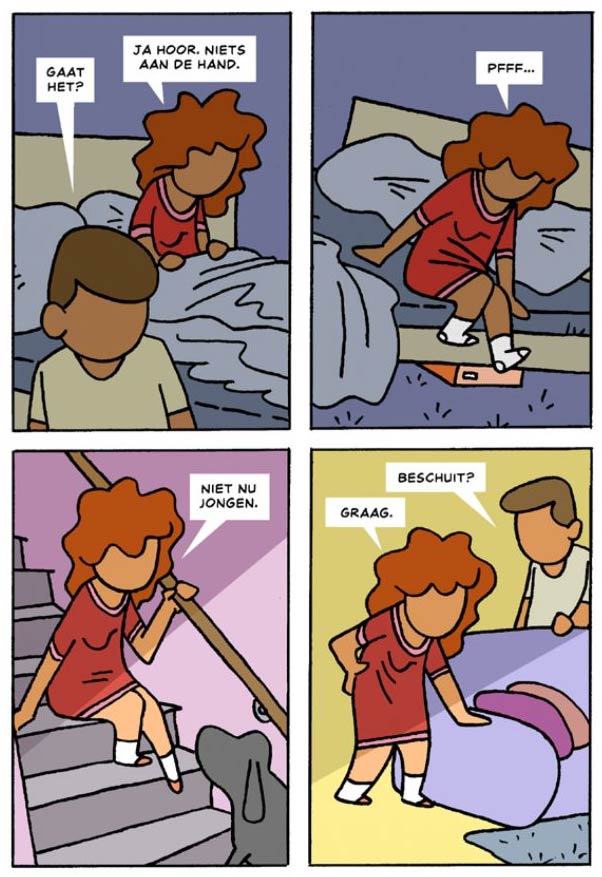 In 2009, Ritstier's wife of 29 years passed away from breast cancer. The artist began working on a very personal graphic novel about her illness and subsequent death in 2011. He restarted the effort three times before he found the right approach. Ritstier openheartedly covered the entire process his family went through: the questions, the fears, the treatments and the end. He chose a simplified graphical approach, drawing characters without faces. This way, the author could keep more distance to the heavy subject matter, and put more expression in the character's movements instead of cartoony faces. 'Wills Kracht' was published by SubQ in 2017. The subsequent period of mourning and going on with life is covered in the book's follow-up, 'Opstaan... en doorgaan - Verder na een verlies' (2020). In 2024, Ritstier released what is so far the final installment in his autobiographical trilogy, 'Maandag Gaan We Scheiden', detailing the difficult divorse of his second wife from her first husband.