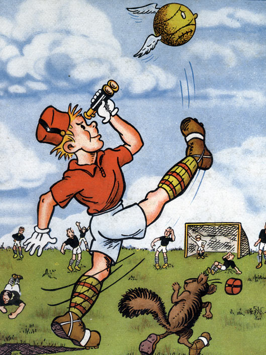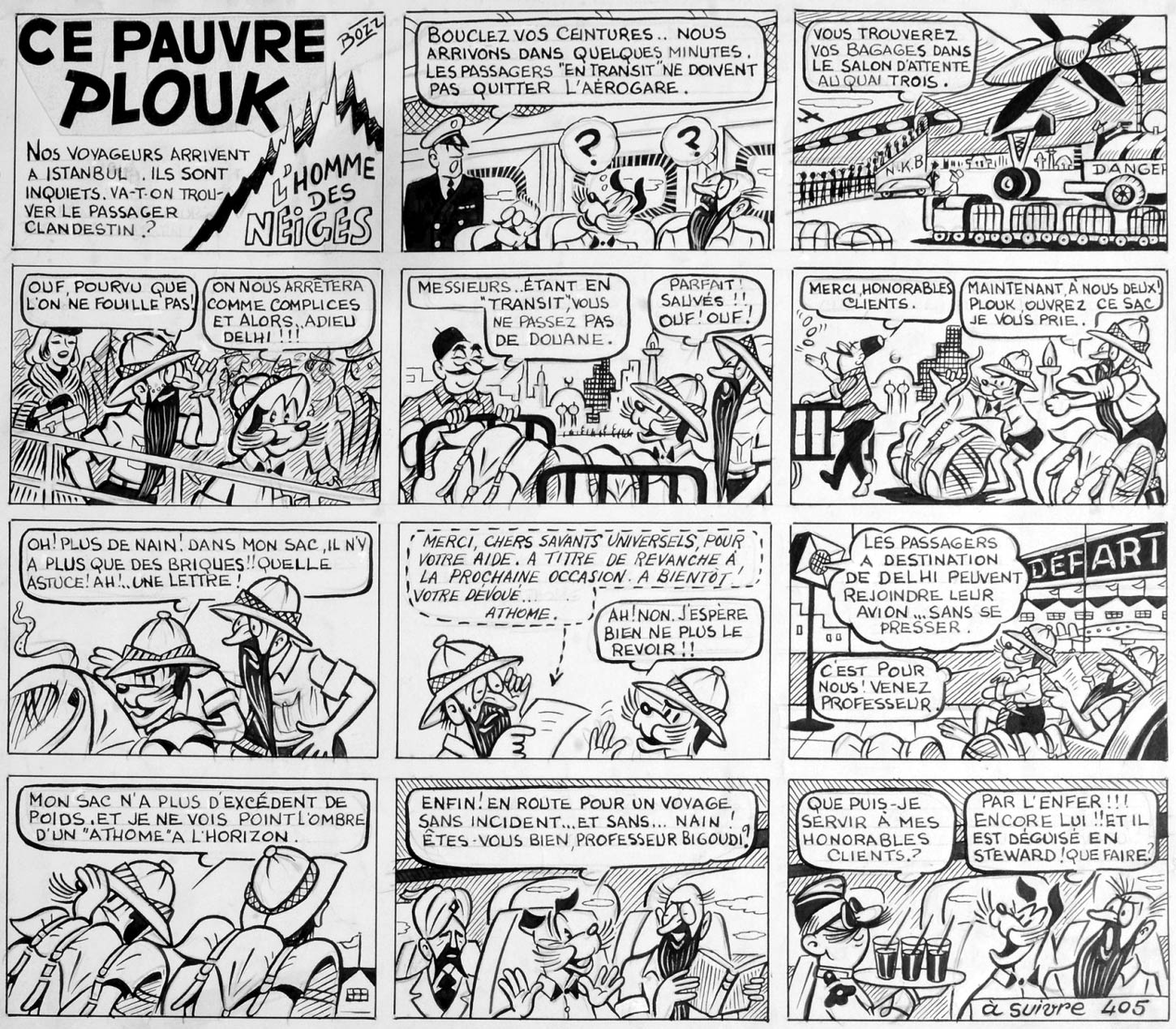 While appearing in a host of magazines during the second half of the 1940s and early 1950s, Rob-Vel remained mostly active for the daily press through the Opera Mundi agency. Between 1946 and 1969, he resumed his 'M. Subito' strip, but also introduced other creations, again using the signature Bozz. In the late 1940s, his comic strip about the boy scout 'Jean-Loup' ran in an agricultural paper. Between 1956 and 1958, he resumed his Pierrot strip 'Ce Pauvre Plouk' as a newspaper comic in the Récreation supplement of the Belgian newspaper La Dernière Heure. This comic starred a semi-anthropomorphic dog, who embarks on various detective adventures with his human companion.