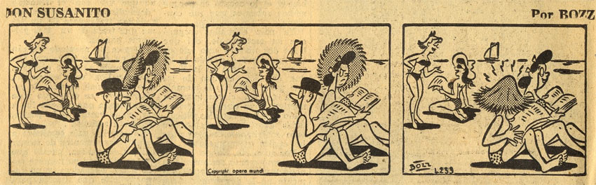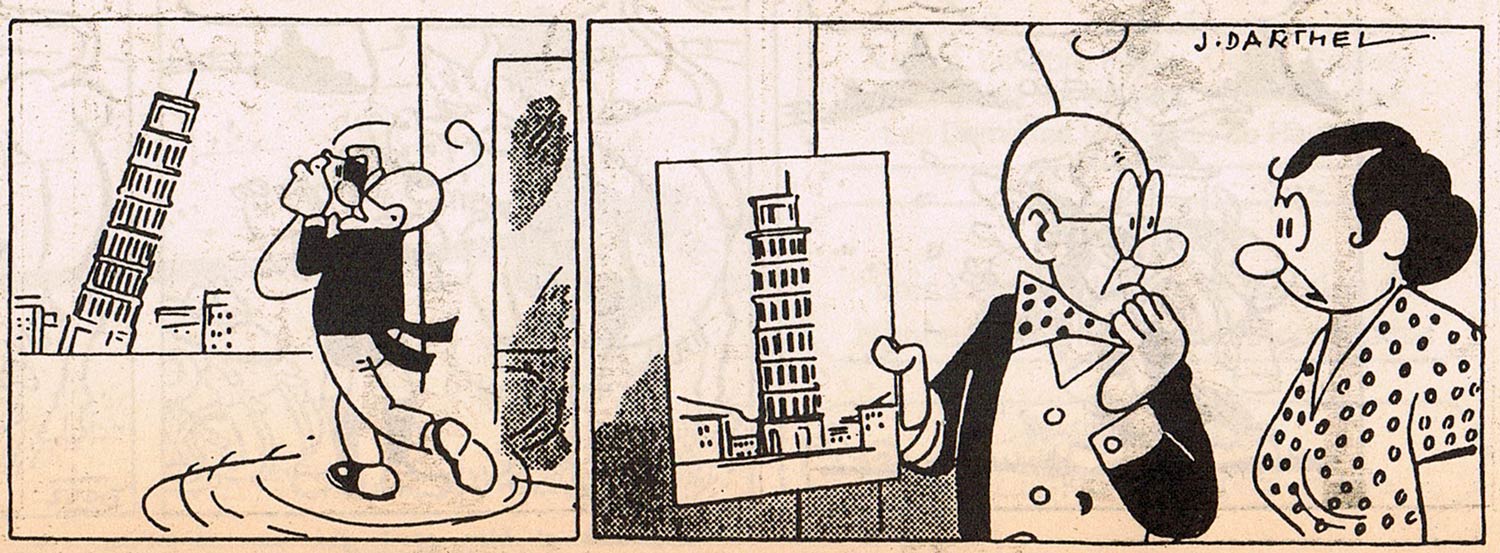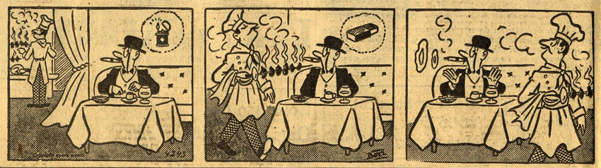 When he returned to France in 1936, Robert Velter initially lived with his aunt in Clamart, a town in the Parisian region. Dedicated to becoming a professional cartoonist, he began submitting work to agencies and magazines in Paris. In 1936, Velter sold his first strip to the Opera Mundi agency. Remarkably enough, it was called 'Tintin', just like the Belgian reporter character created by Hergé seven years earlier. Velter's version, which ran on a weekly basis in Le Petit Parisien, was however a completely different character, and mostly a predecessor to the cartoonist's long-running pantomime gag strip 'Les Avatars de M. Subito' (1936-1969). The title character, Mr. Subito, is a little man with a pointy nose, tiny mustache and bowler hat. Among the other characters are Subito's wife Dorothée, their dog Presto (modeled after the Velter family dog Presto) and his friend Narcisse. The comedy is absurd and slightly British, underlined by the fact that Velter signed the cartoons with the pseudonym "Bozz", in reference to Charles Dickens' similar pseudonym Boz. During the 1930s, Velter also translated American comic strips printed in Le Petit Parisien and other newspapers of the Excelsior press group.
