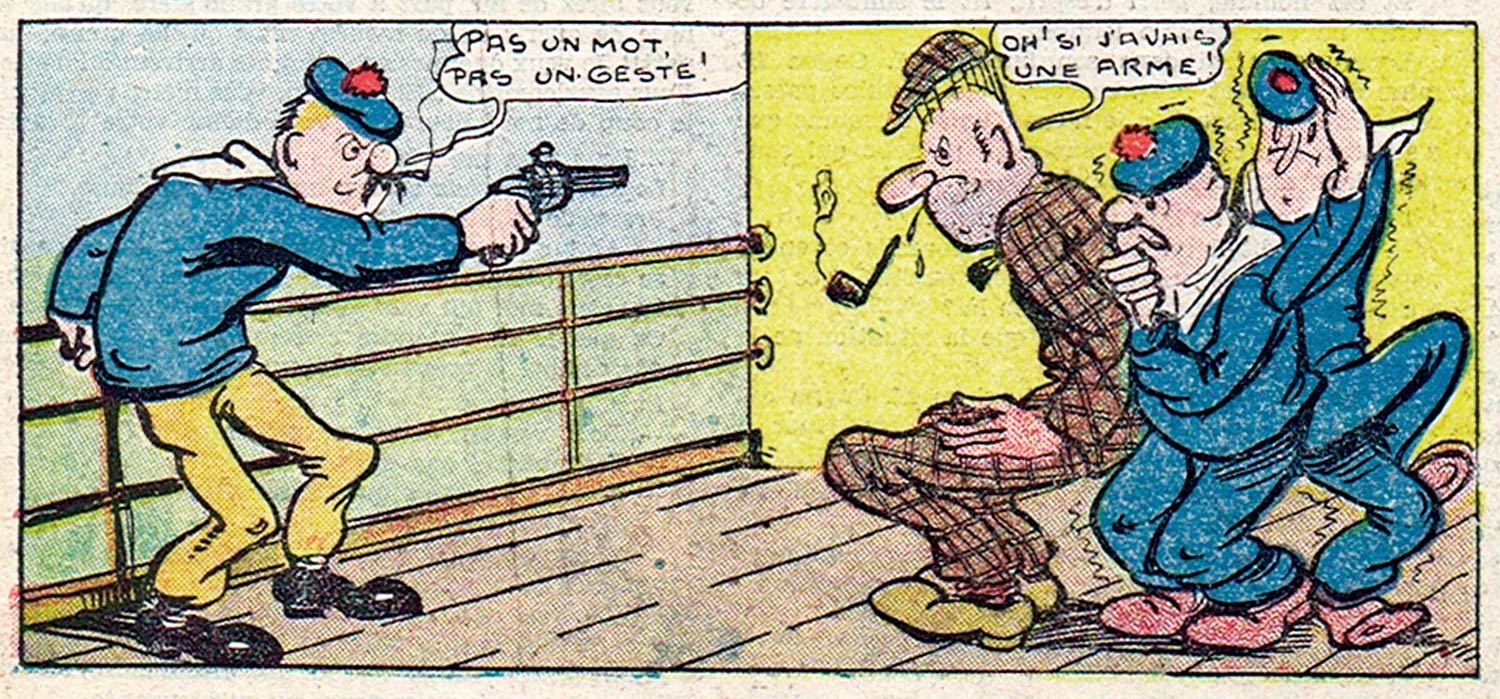 Besides Spirou's title comic, Rob-Vel and his wife contributed several additional features to the brand new magazine. Already in the first issue, Velter picked up one of his earlier unused concepts and introduced the readers to 'Bibor et Tribar' (1938-1939), a serial about two bumbling sailors. It ran in Robbedoes under the title 'Janmaat en de Sinjoor'. During the first year, Rob-Vel also contributed a gag strip about a mischievous kid called 'Babouche' (1938), while his wife wrote the melodramatic adventures of 'Zizette'. Most of the magazine's further comic content were translated American comics - the only other original artist in Spirou was Fernand Dineur with his 'Tif et Tondu' feature. In 1941, Dupuis released a comic book compilation, 'Les Avontures de Bibor et Tribar - Tif et Tondu' (1940), collecting adventures of both 'Bibor et Tribar' and Dineur's 'Tif et Tondu' comic. It was the second comic book of the publisher, following 'Les Aventures en Afrique de Fred, Mile et Bob, Gamins Belges' (1940) by François Gianolla.